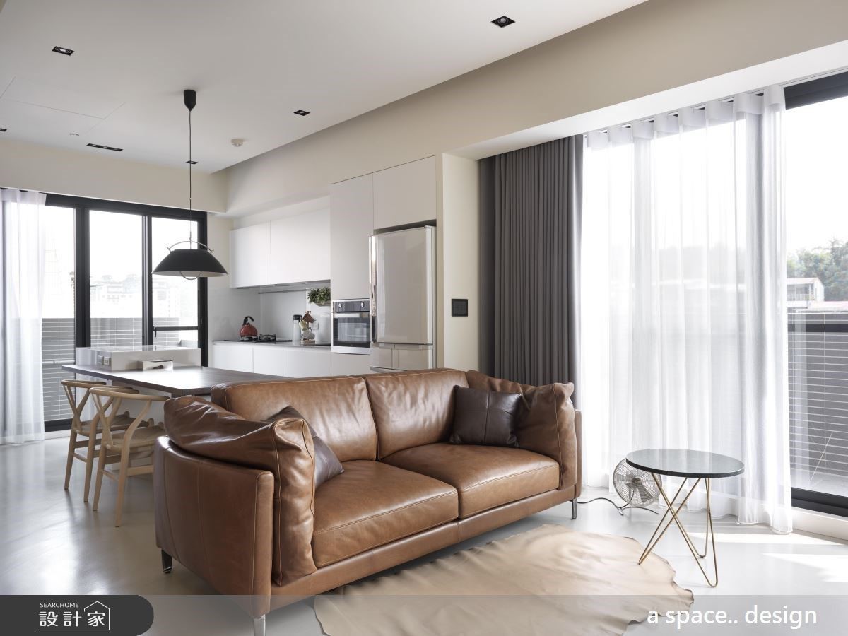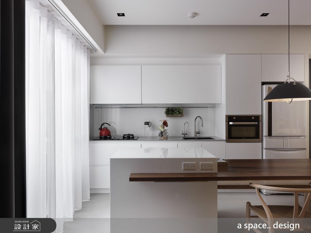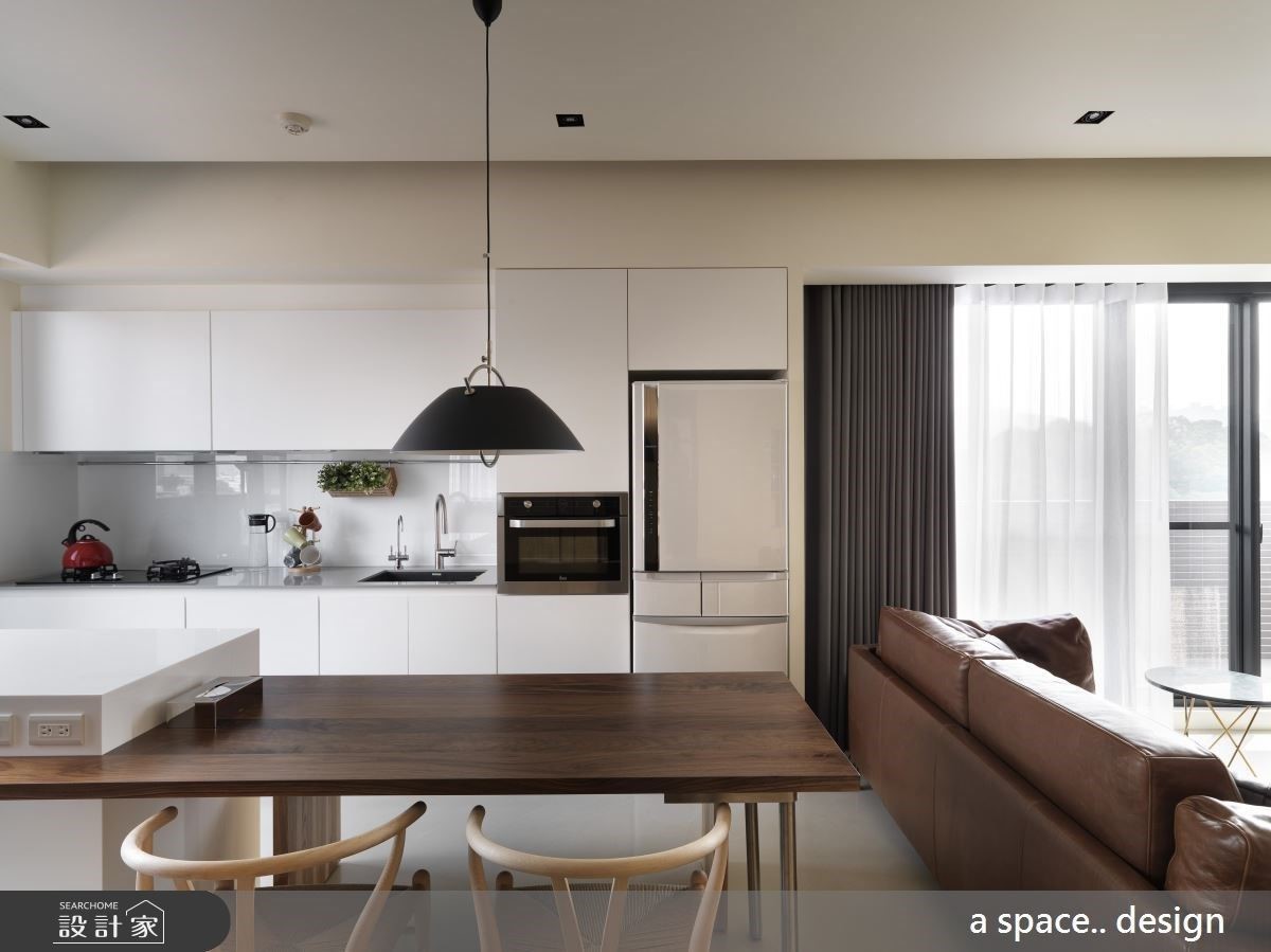 開放的公領域搭襯落地窗外的良好採光,無限延展空間寬敞度;純白無瑕的電視牆不自覺放大觀影視線,簡練的燈具佐特殊選色的小茶几,則替客廳增添精緻氣氛。垂直於沙發後方的餐桌設計,串接中島吧檯與一字型開放廚房平行安排,烹飪動線順手便利,用餐範圍也得以延伸,搭配極簡白色系的廚具,奠定整齊簡練的生活風格。