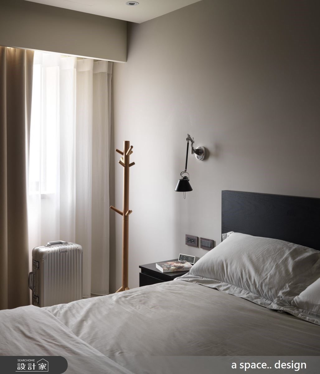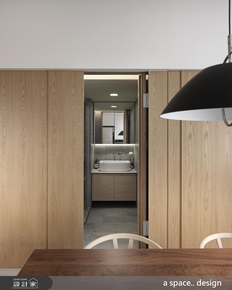 進入私領域前,一座大型木質收納櫃映入眼簾,轉角處的開放櫃格減少大型收納櫃視覺壓力,同時身兼藝術收藏品的展示舞台;沉穩灰質衛浴間入口以隱藏門方式隱形於公共空間,賦予隱私同時呼應整齊空間視覺。