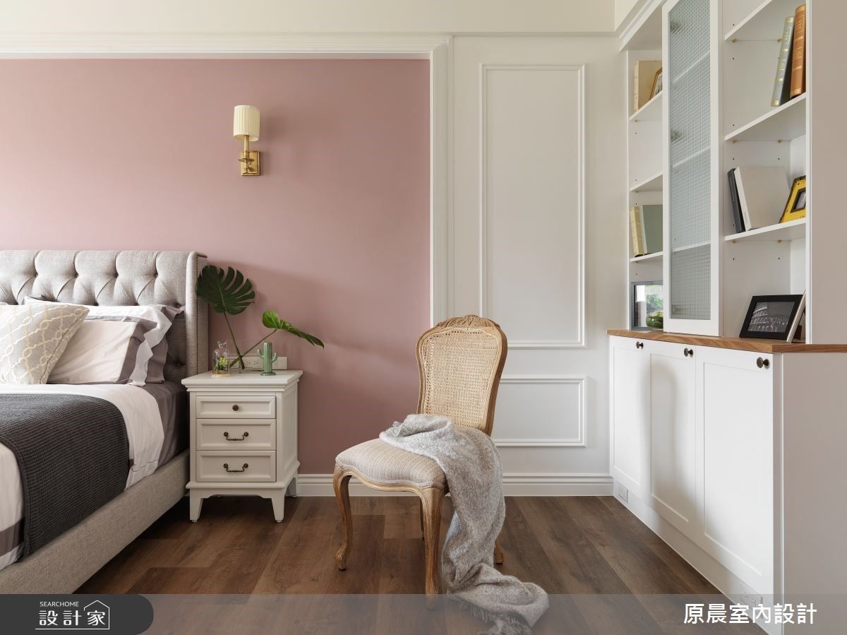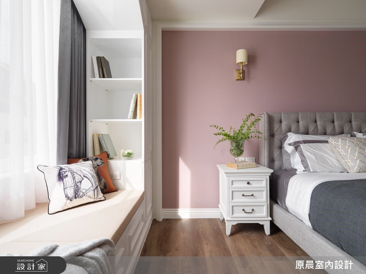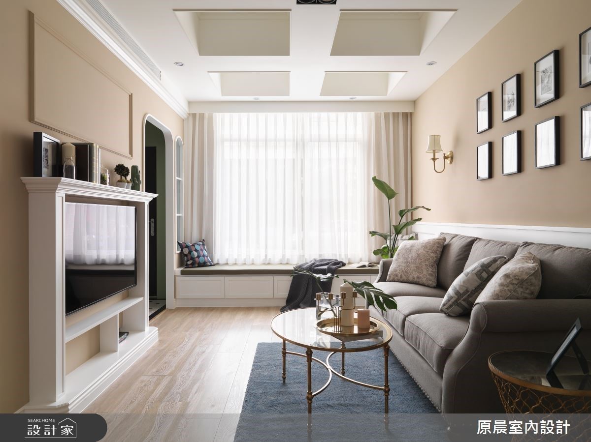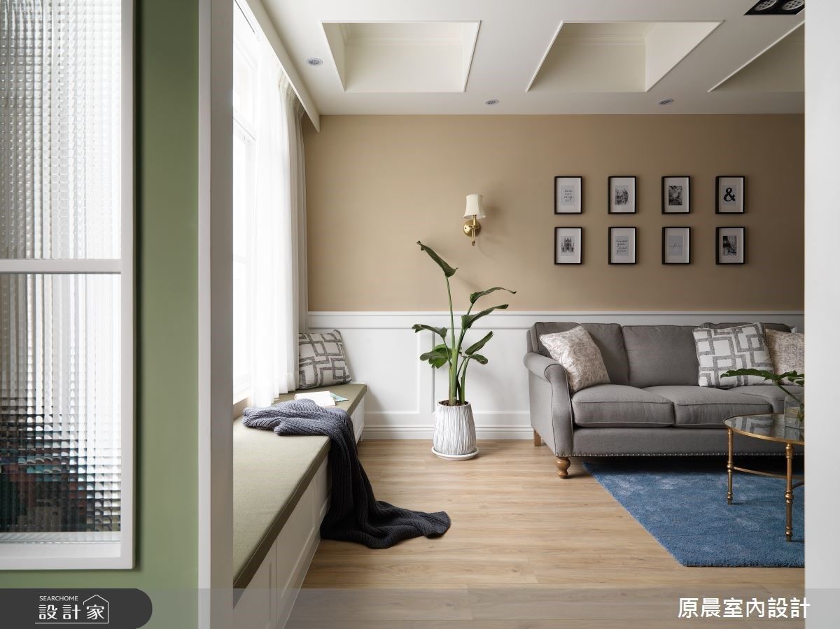 設計師將公領域空間挪出部分規劃為入門玄關,作為轉圜空間;同時以帶灰階草綠色譜畫,創造進門第一視覺的美式清新感受。客廳電視牆以壁爐意象呈現,希望為一家人塑造凝聚力的氛圍。天花板則有大樑橫跨問題,透過格狀造型設計,創造假樑概念,為整體公領域增添更多視覺層次感;而面對廚房縱深不足的屋況,設計師特別將廚具以開放式規劃,營造美式鄉村風的韻味。主臥捨棄繁鎖裝飾語彙,牆面採用深粉色調,賦予一處舒適的睡眠場域;並於窗邊規劃陽光臥榻,讓屋主在悠閒的午後,也能在陽光的伴隨下,細細的品茗生活情調。