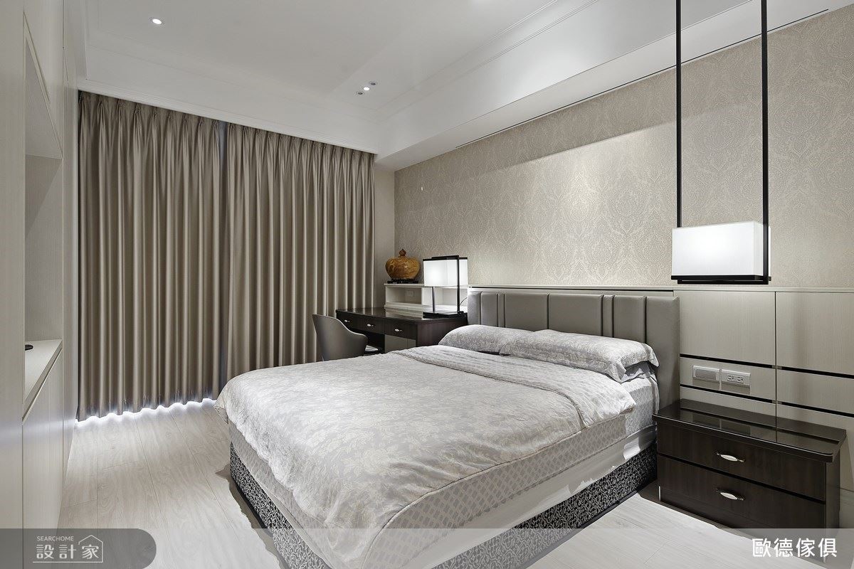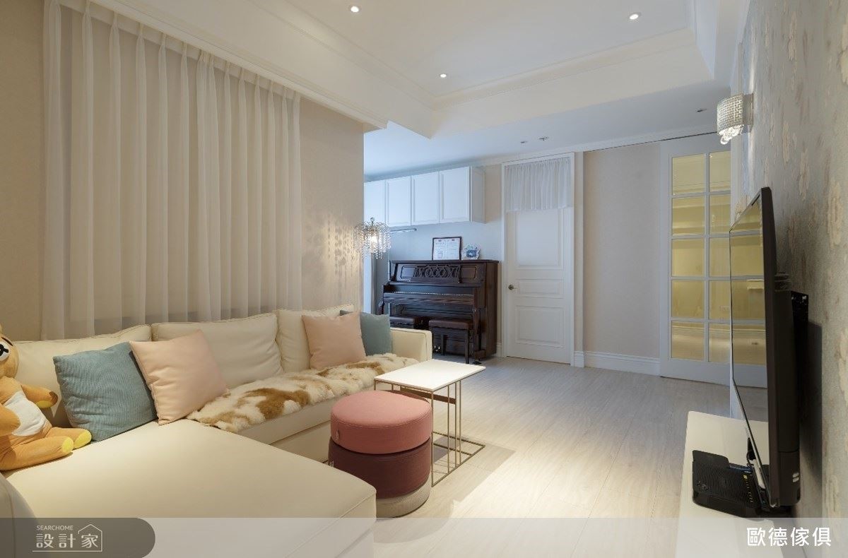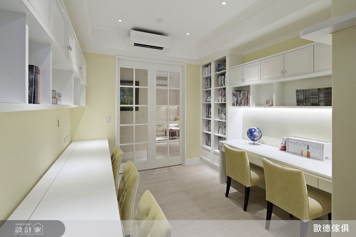 玄關訂製上下分層櫃體,體貼屋主擺放一家外出物品,下層則預留排氣空間,解決發霉困擾。客廳規劃上,設計師精心丈量影音設備尺寸,並隱藏電線於櫃體後方,量身打造俐落美型電視牆。天花則搭配耀眼水晶吊燈,佐以立面經典壁爐造型,詮釋優雅奢華的新古典風華。餐廳櫃體不僅設計幾何展示架擺放居者收藏,更貼心採用按壓開門方式,便利屋主拿取日用品。女主人臥房延續淺色語彙,並於床頭牆鋪陳細緻花紋壁紙,賦予場域典雅浪漫氣息。女兒房則考量孩童喜好,貼心設計窗邊書桌,型塑明亮閱讀氛圍,更增設長型臥榻,凝聚親子共樂時光。