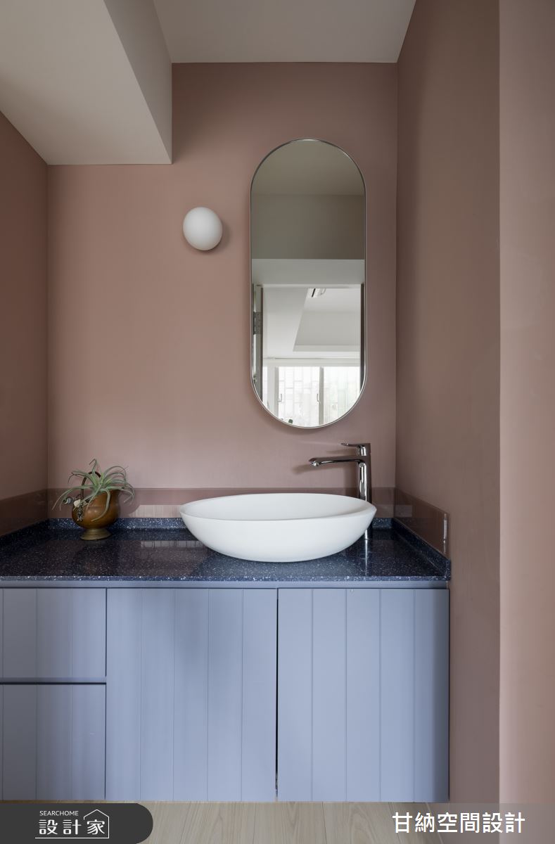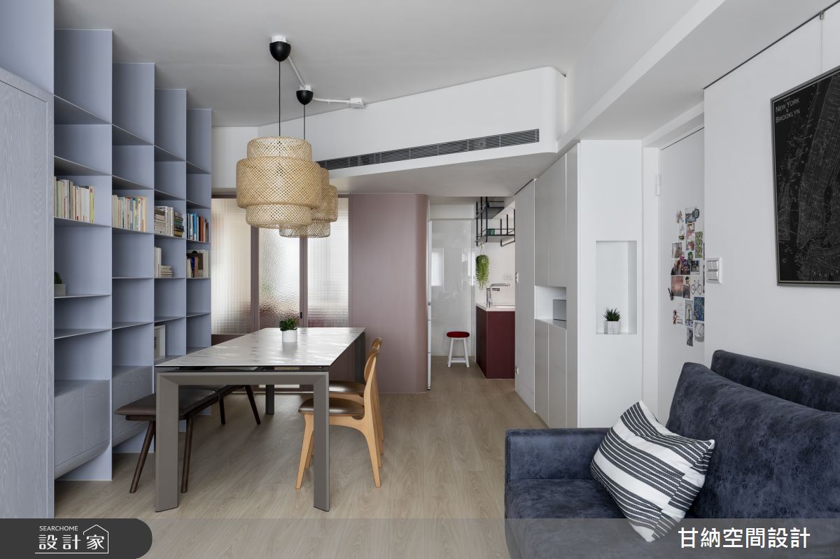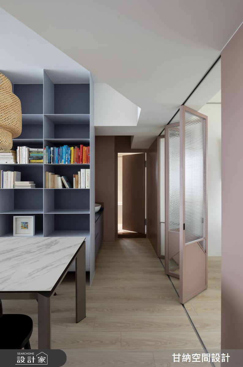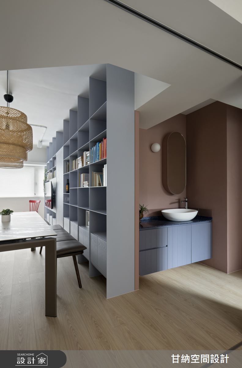 以女兒最愛的故事繪本填滿客廳區域,青藤色鐵件結合電視牆方正有序地劃分,在海量收納下營造出錯落的律動感,色彩濃度的調和創造出平面的層次。相同手法隨即渲染入書房與餐廚區,維持色彩的明度彩度,由淡紫轉為乾燥玫瑰粉,替空間做了唯美的轉場。書房以同色系折疊拉門鑲嵌毛玻璃拼湊透映視角與光線,即便屋主忙於工作間,仍可轉向看見孩子獨立嬉戲的背影,也一併優化餐廚區的動線,讓想像力設計思維,賦予家中每一道牆與轉角特別存在而無可取代的意義。