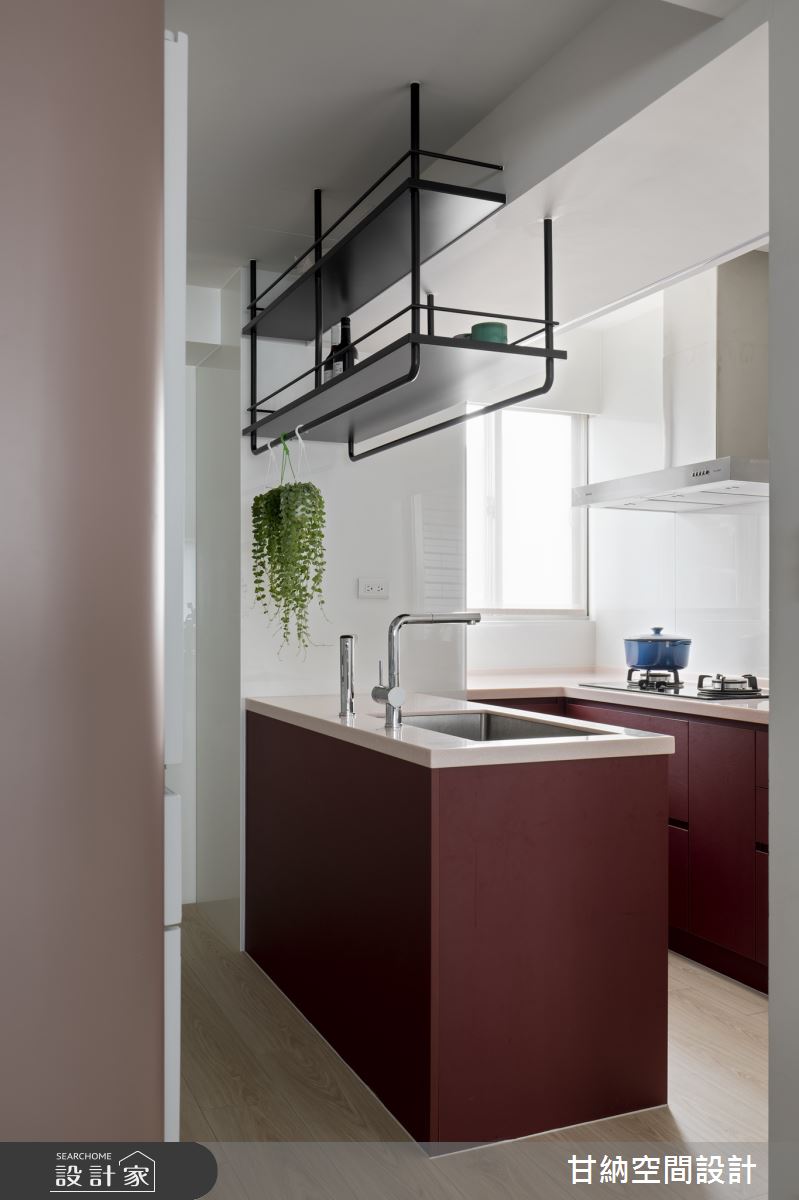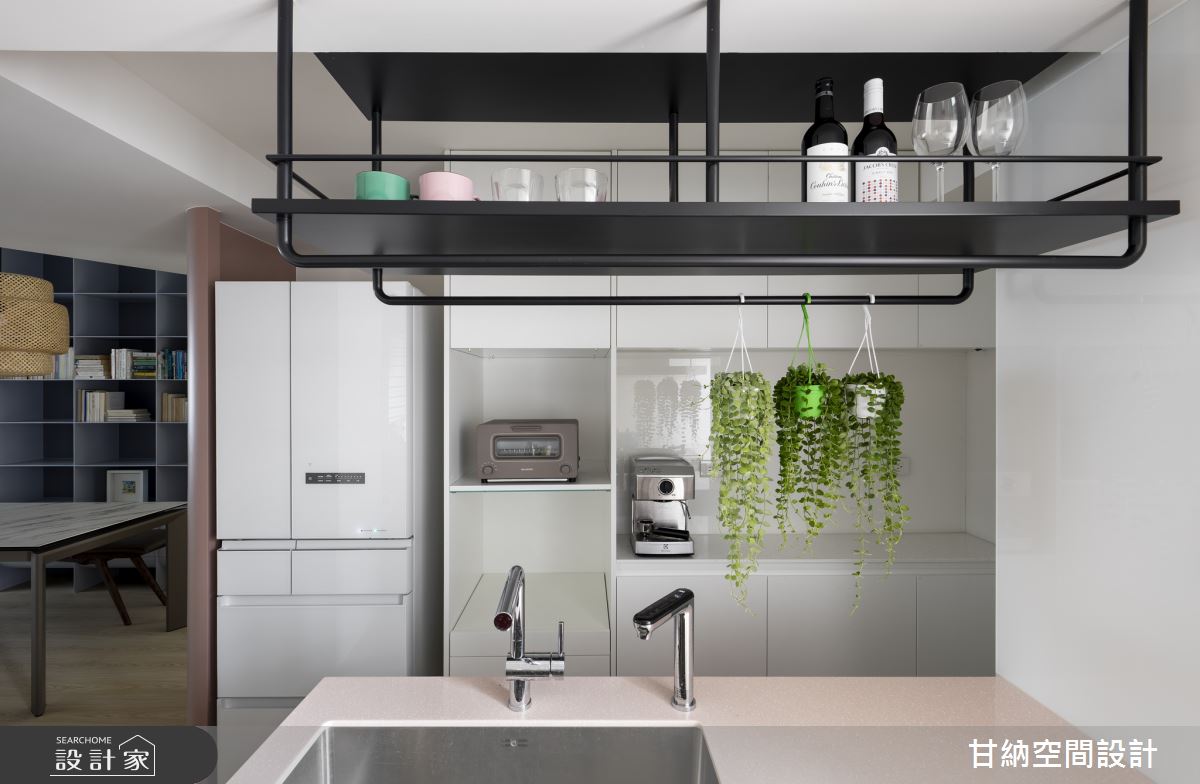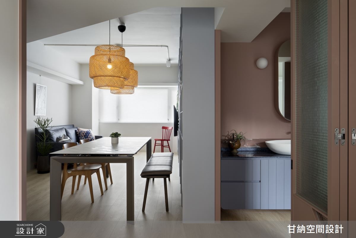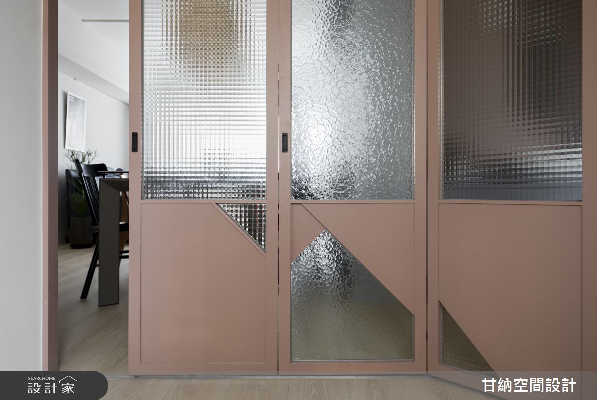 以女兒最愛的故事繪本填滿客廳區域,青藤色鐵件結合電視牆方正有序地劃分,在海量收納下營造出錯落的律動感,色彩濃度的調和創造出平面的層次。相同手法隨即渲染入書房與餐廚區,維持色彩的明度彩度,由淡紫轉為乾燥玫瑰粉,替空間做了唯美的轉場。書房以同色系折疊拉門鑲嵌毛玻璃拼湊透映視角與光線,即便屋主忙於工作間,仍可轉向看見孩子獨立嬉戲的背影,也一併優化餐廚區的動線,讓想像力設計思維,賦予家中每一道牆與轉角特別存在而無可取代的意義。