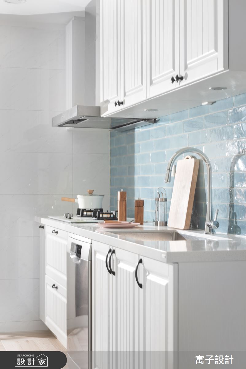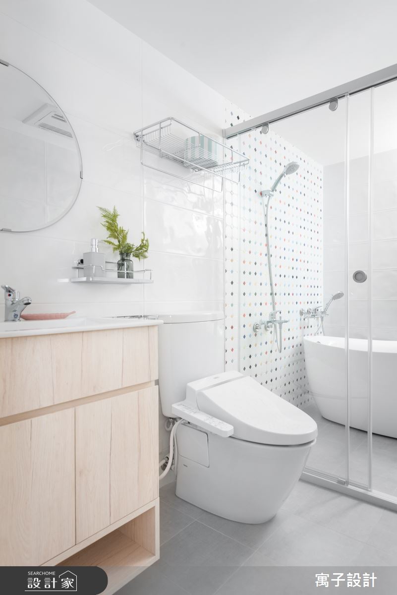 喜歡白色為主色調的衛浴空間!淺木色浴櫃帶出自然氣息,而淋浴區單牆則以白底點綴彩色小口磚展現層次質感。