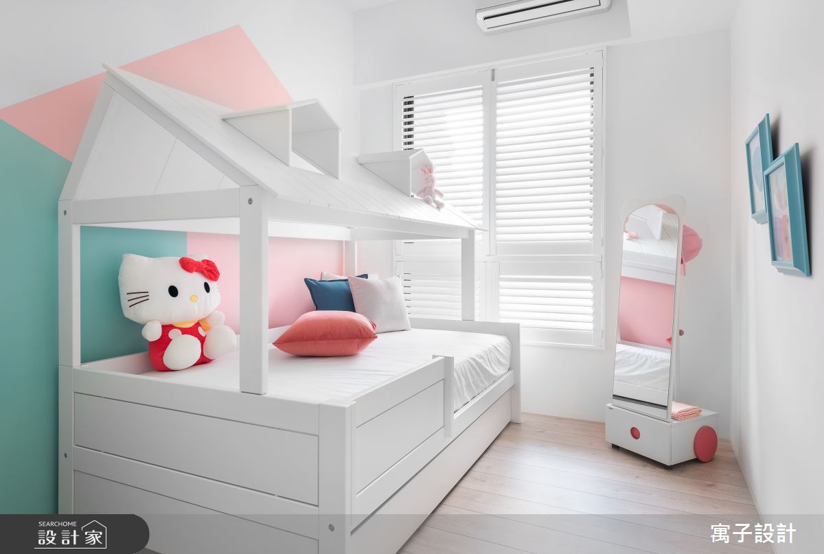 入口巧克色圓形壓紋設計大門在進門前即昭示我們將進入一個奇幻的樂園之中,玄關以粉嫩三角磚鋪設地坪,並與薄荷綠鞋櫃完整落塵區,鞋櫃中空的設計可以擺放小物,亦能讓視野更加開闊。純白的客廳搭配大開窗設計讓陽光肆意灑落,空間更顯得明亮輕盈,莫蘭迪色調的沙發與單椅搭配淺色木地板給予溫潤氛圍,橘紅色的跳色茶几則為空間畫龍點睛。臥室延續公共空間的莫蘭迪色調,以乾燥玫瑰粉作為床頭跳色,搭配同色系的床罩十分浪漫,兒童房牆面則以粉綠、粉橘的幾何對比色盡顯活潑。