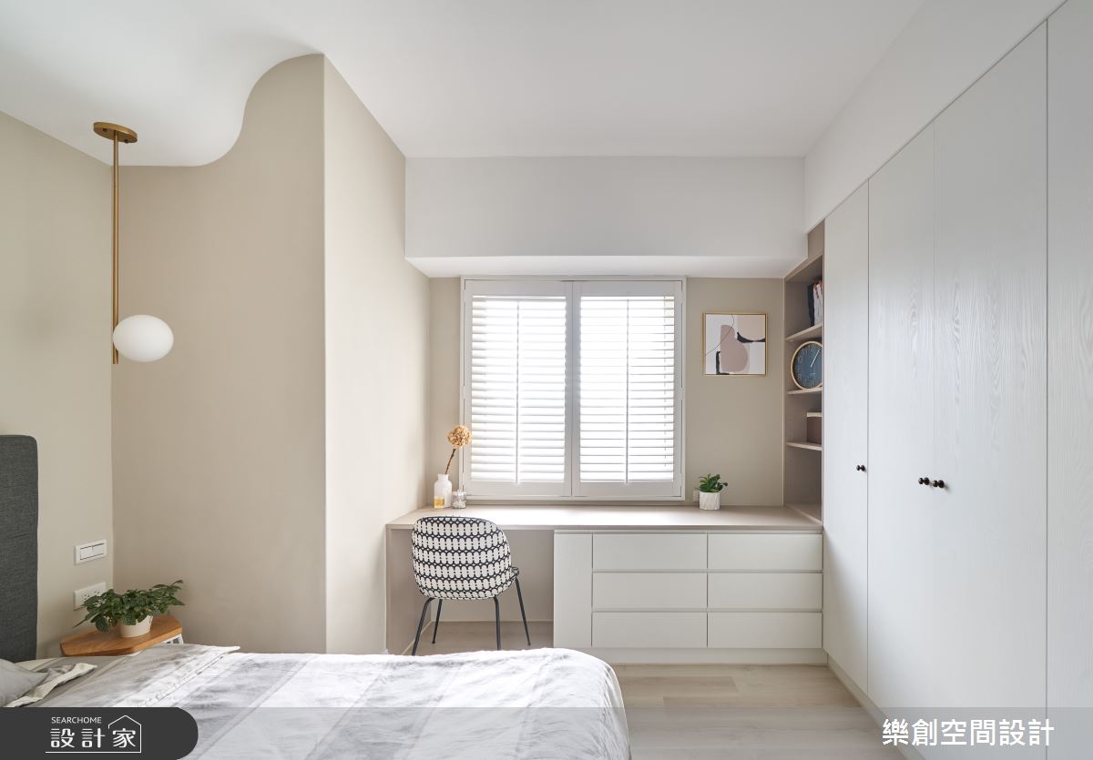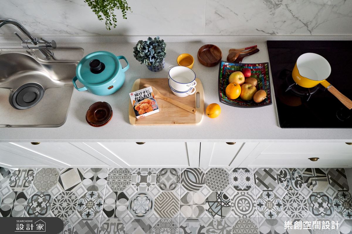 另外一邊半開放式的廚房與多功能室以玻璃推拉門做輕隔間,原本採光及通風不良問題也迎刃而解。廚房更延伸玄關的西班牙花磚地坪,讓場域之間得以串聯。主臥內,設計師以弧型修飾床頭大樑,化解風水煞氣,再加上造型吊燈為簡約的空間增添個性,整面的衣櫥則滿足收納需求。