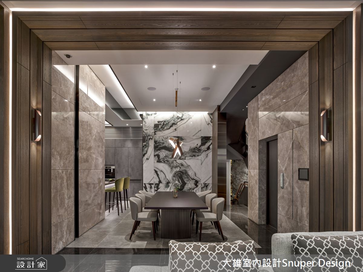 地下室車庫以超跑博物館為主題,陳列著屋主絕美的跑車收藏,光膜天花的安排讓光均勻灑落在每一處車身,還透過光帶導引出動線與韻動感,巧妙呼應超跑身形,沉浸精彩光氛層次裡;另外,透過一整面牆展示屋主收藏的車子模型,訂製的壓克力車座營造輕盈視感,且背景搭佐均勻襯光,可清楚展演每台車的款式與細節。一樓是客餐廳場域,大面窗景引入戶外的山巒,透過空間裡的木紋色澤呼應自然綠意,烘托溫潤自然之美;沙發背牆以展示收納櫃展現異材質活用術,纖細的鍍鈦管、鐵件分割與格柵造型,與背景石材的紋理相互輝映,交織出細膩且精工質感的視覺美學。餐廳空間裡,天地壁上透過線條讓視覺延伸,搭配沉穩的基調更添安定,透過跳色綠高腳椅擦亮視覺新意;一道雲山水大理石擘劃出餐廳領域的非凡品味,藉由獨特的拼花呈現,大面塊體堆疊與構圖美感的講究,隱喻聚與合的東方意象,烘托大宅器度。