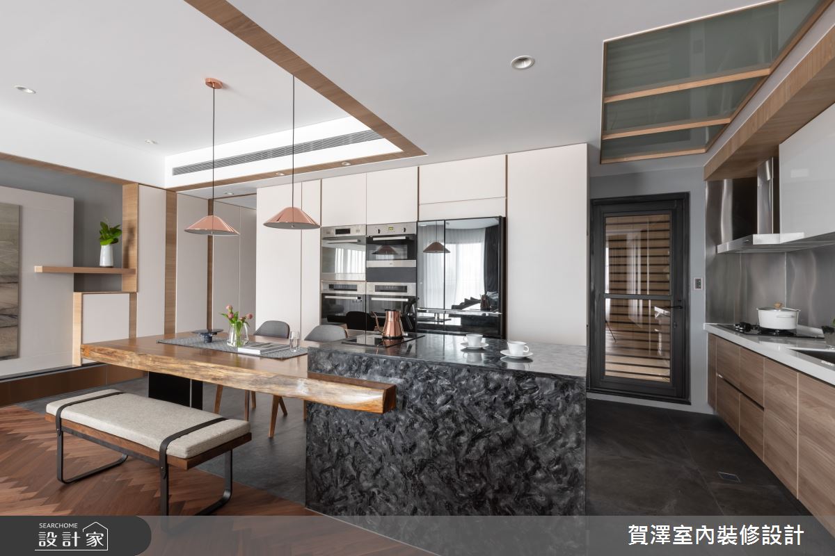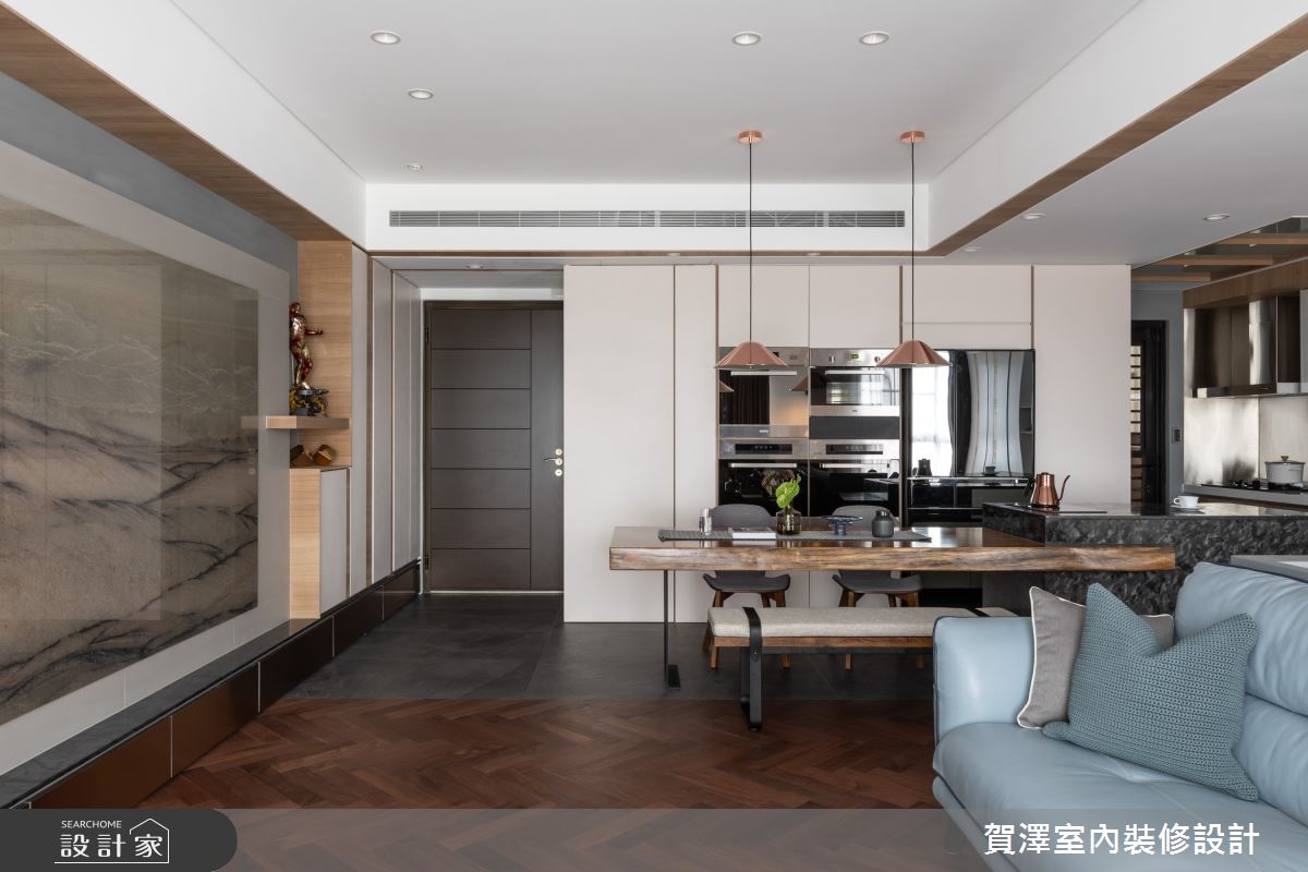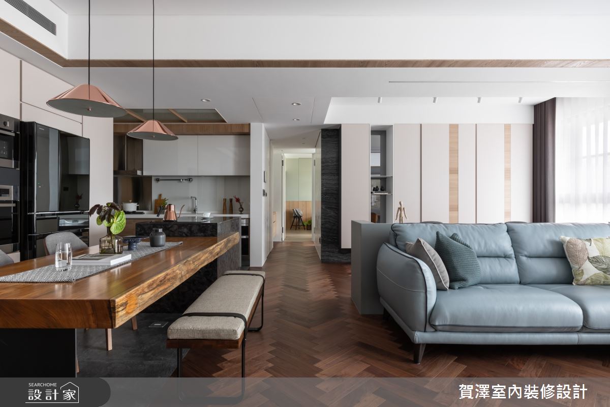 電視牆採取寶格麗大理石,將山水紋路攤開於一家人面前,當屋主坐在莫蘭迪藍的沙發時,能舒適地感受藝術美學帶來的震撼。沙發背牆與書桌合而為一,半高的檯面設計,讓家人可以於各領域中互動無礙。另外,設計師拆除原有廚房隔牆,在餐廚空間設置結合實木餐桌的夜光石大中島,會依據角度、燈光不同顯現特殊光澤,形成機能十足的亮眼一隅。