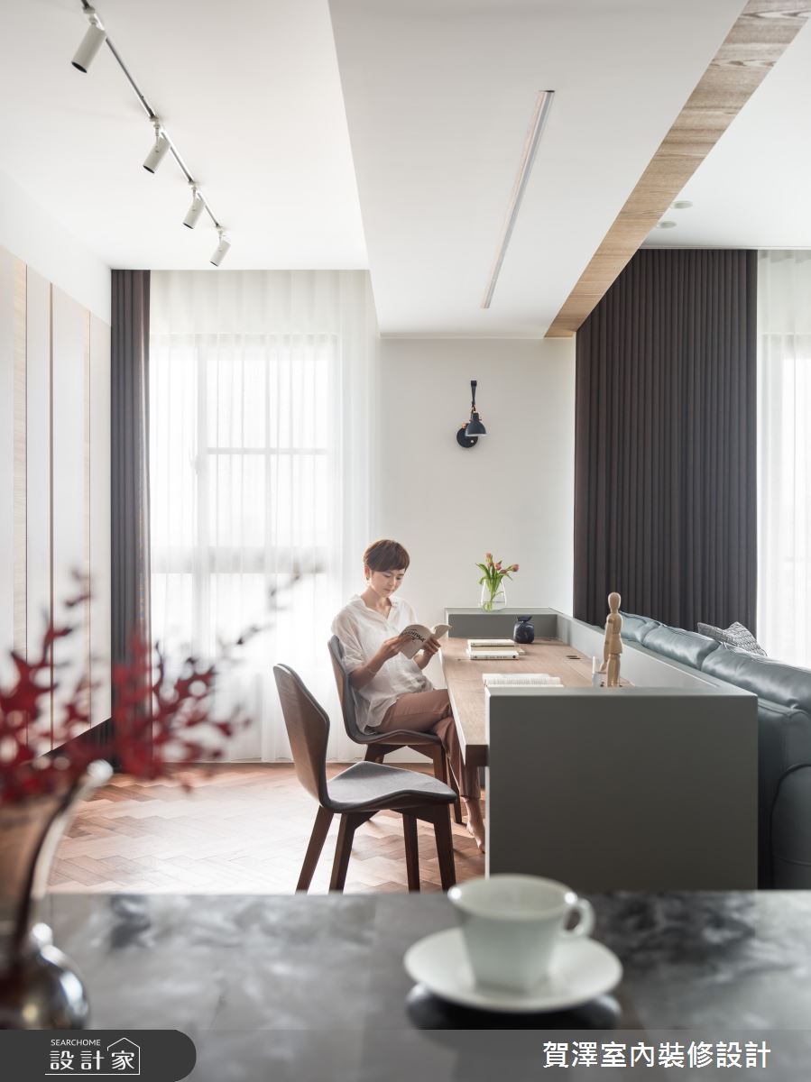 玄關櫃的木紋線條一路延伸至天花板,串聯整個公共空間,同時在電器櫃、書櫃也都透過類似的紋理做裝飾,讓自然氣質貫穿室內。地面的水泥灰磁磚和人字拼木地板,劃分開放式公領域的格局邊界,卻又達成材質上的自然默契,讓光線、動線、視線能夠毫無阻隔地遊走居家。