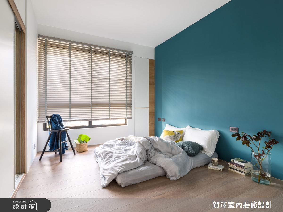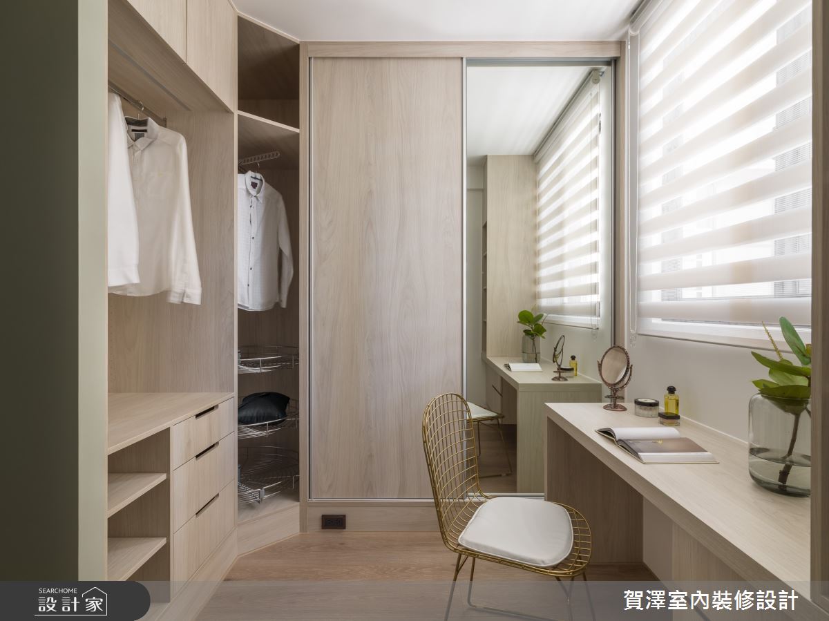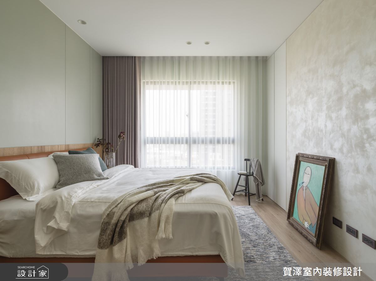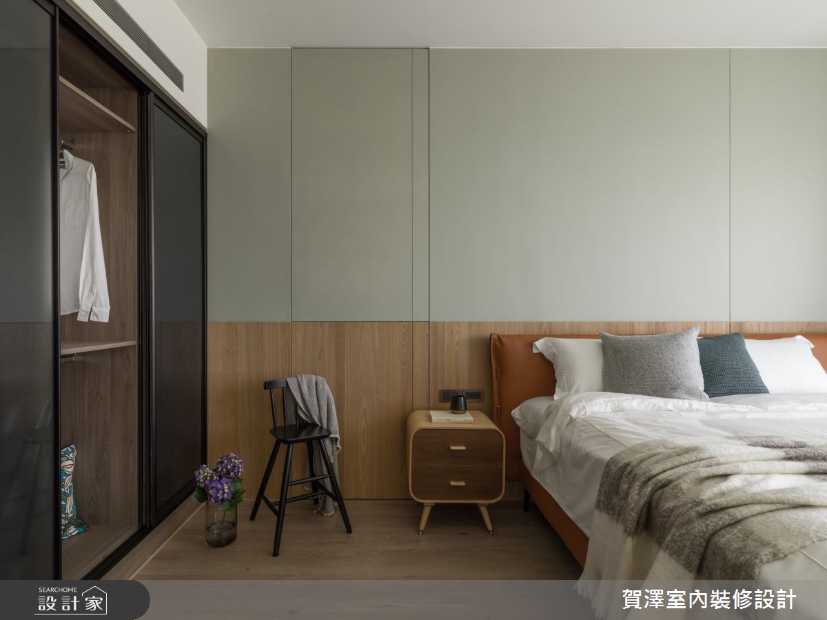 主臥床頭牆以莫蘭迪綠搭配木皮,與手作質感的特殊漆牆面,相互輝映,形成放鬆愜意的休憩場域。主臥更衣室善用多角形空間,規劃開放式衣櫃和窗邊梳妝檯,給予女主人一處不受打擾的秘密基地。