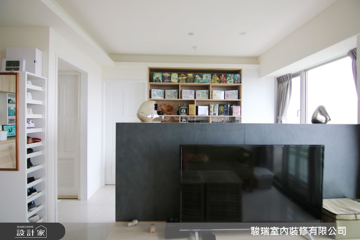 進門玄關處的開放式鞋櫃,不僅加快出門整裝搭配速度,一目了然的排列也有助於收納擺放時間。鄰近大門口的餐廳空間的系統櫃設計,串連玄關及用餐領域,檯面以屋主順手高度設計,便於放置出入門的鑰匙、生活用品;易碎、易生灰塵的餐廚用品杯盤則放置櫃體內,帶來多功能收納機能。位於窗邊旁的客廳採光極佳,延續樑柱位置規劃電視矮牆作為輕隔間,上方不做滿讓室內流暢光影,也為公領域創造了書房新區塊;底部懸空設計帶來輕盈視覺外,靠窗右側收納櫃細心預留高度,提供屋主擺置兩隻愛貓的貓砂盆。