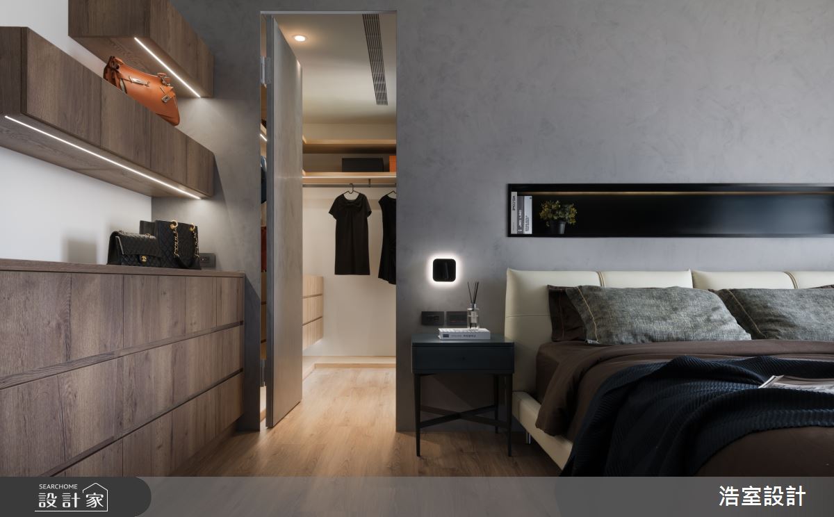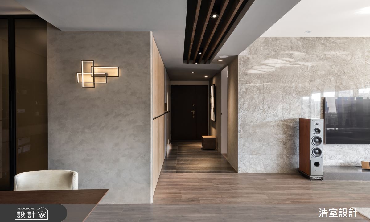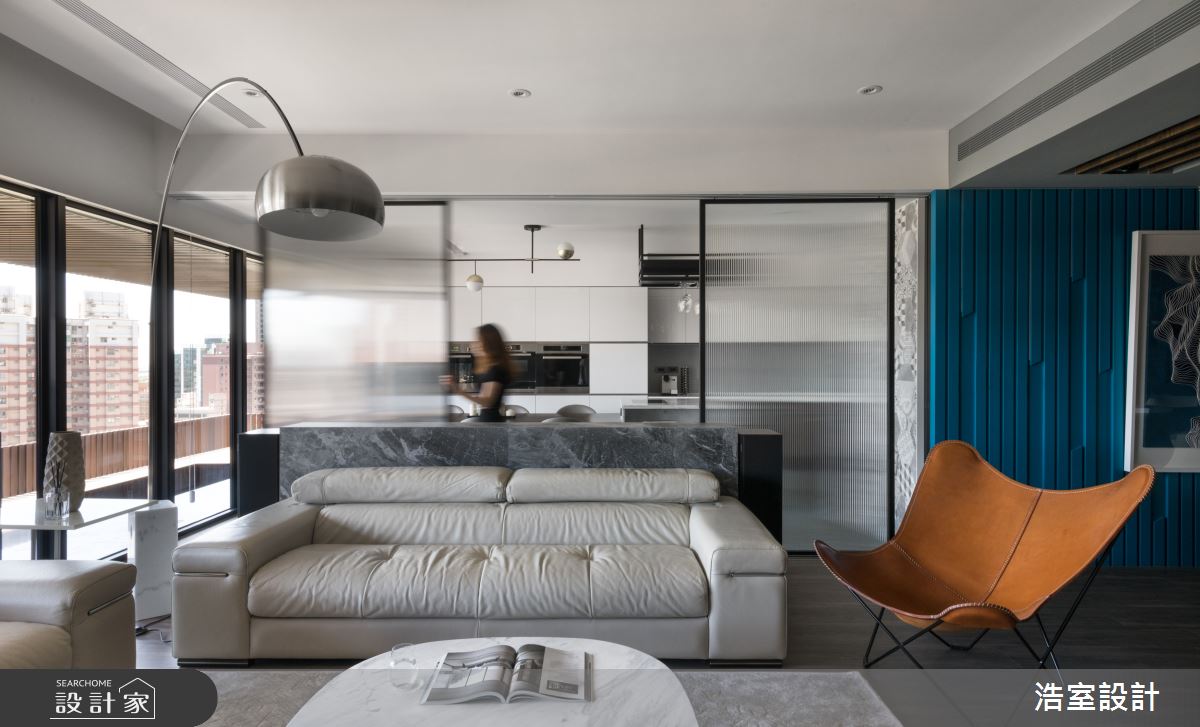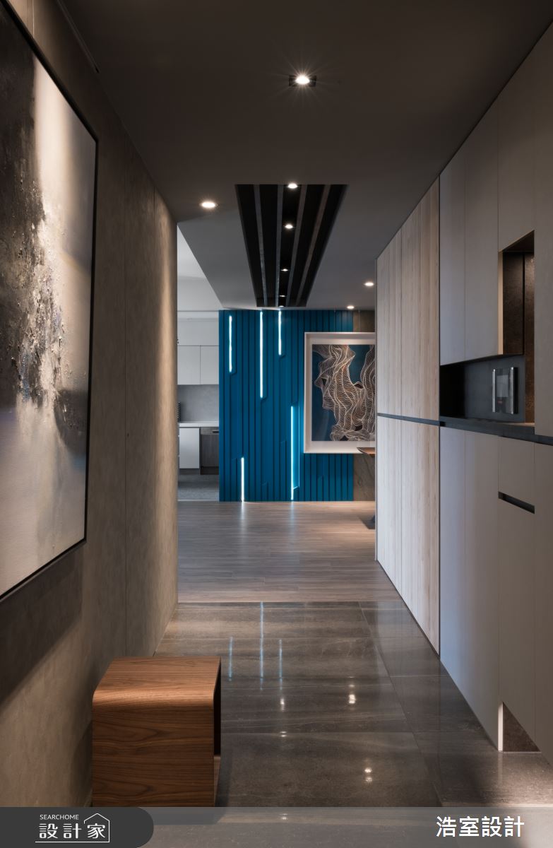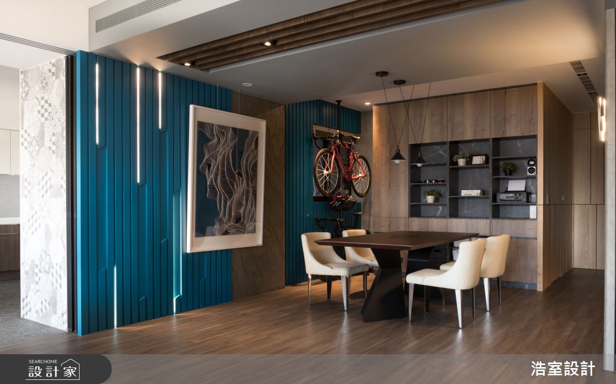 入口玄關透過嵌燈照明,指引通往公領域的動線,間接光源灑落在藝術畫作上,調和出靜謐人文的迎賓風尚。客廳藉由大面窗景引入城市建築之美,也導入充沛採光,隨著視線的延伸與開放,讓公領域更顯開闊舒心之感;明亮光感映照在大理石電視牆上,一展恢弘氣度;沙發後方以石材矮牆界定餐廳領域,與親友享受假日時的派對時光,特別規劃玻璃拉門,烹調時可關上門扇,保持公領域的空氣清新,也保有領域獨立性。餐廳區透過漆上藍色的長條木紋堆疊出立面,伴隨條狀LED燈的局部點綴,創造光影美感;壁面中央結合大幅線條感的藝術畫作,呼應整體造型且醞釀漸層視感;另一側牆面,以鐵件層架打造美學展示區,還特別搭起單車陳列架,讓屋主興趣與收藏的物件成為家的動人元素。