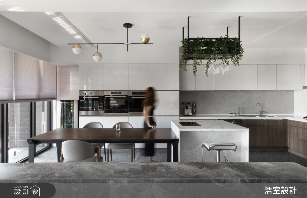 廚房空間裡,原木餐桌與中島採L形擺設,滿足更多人能共享料理與佳餚樂趣,也拉出流暢的日常動線,餐桌更可隨需求彈性調整位子。