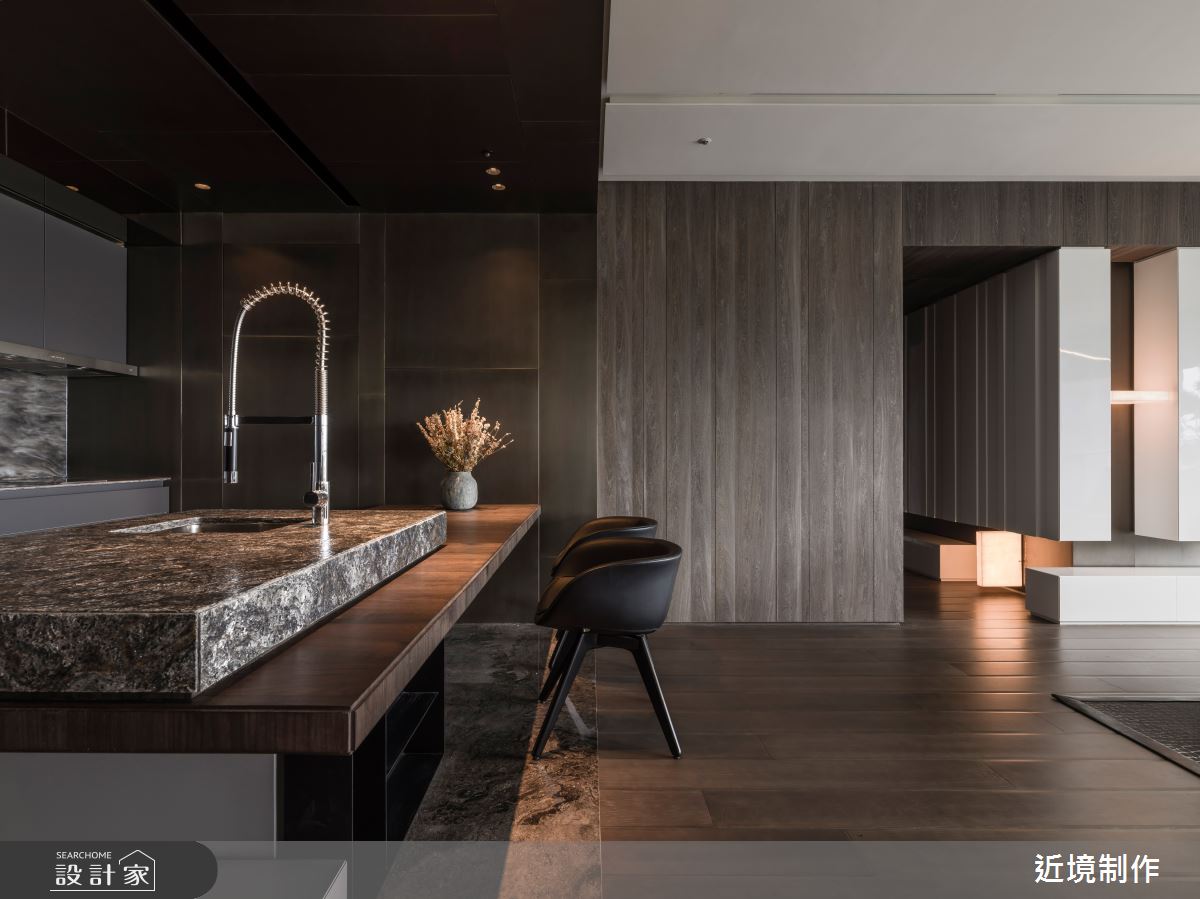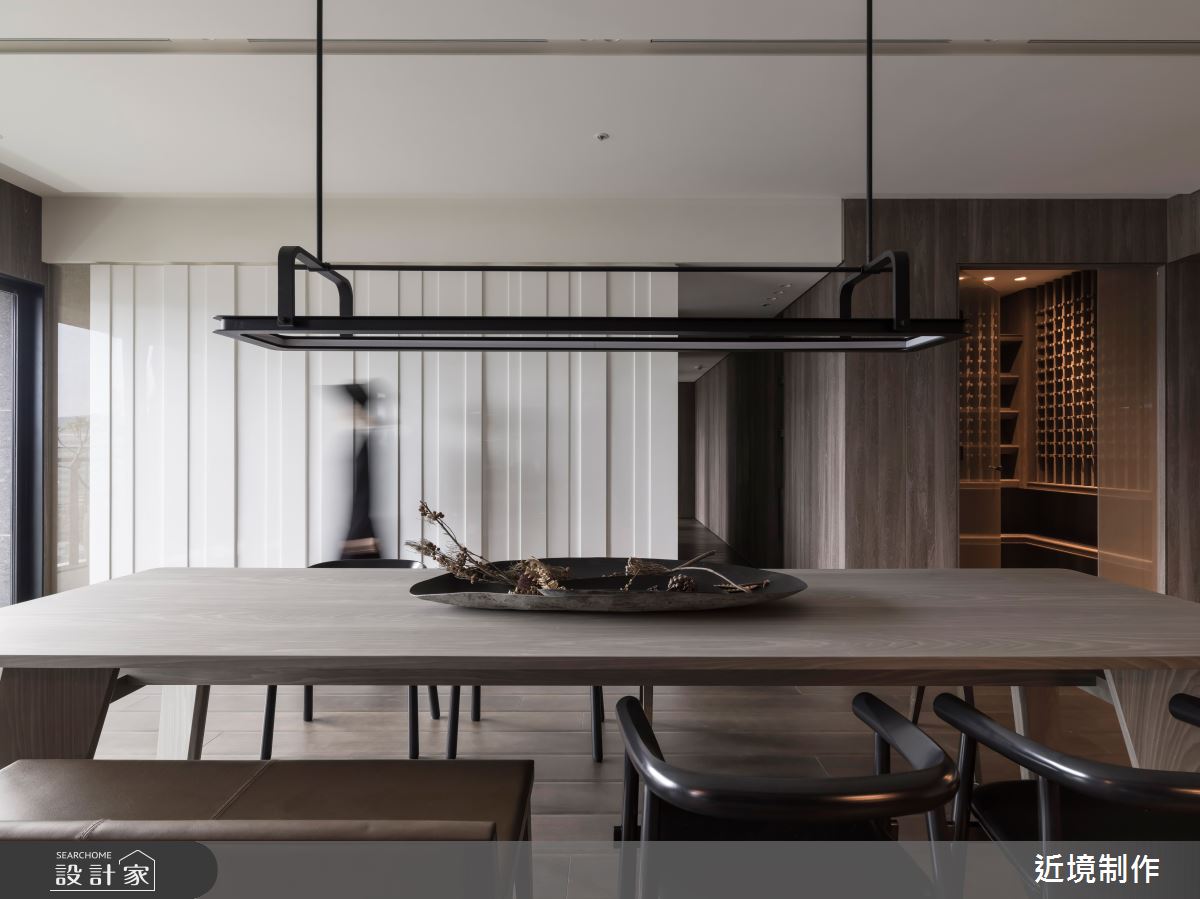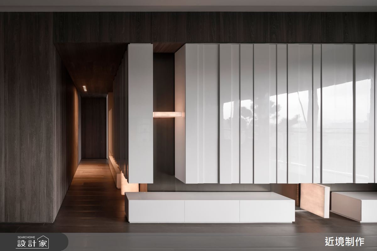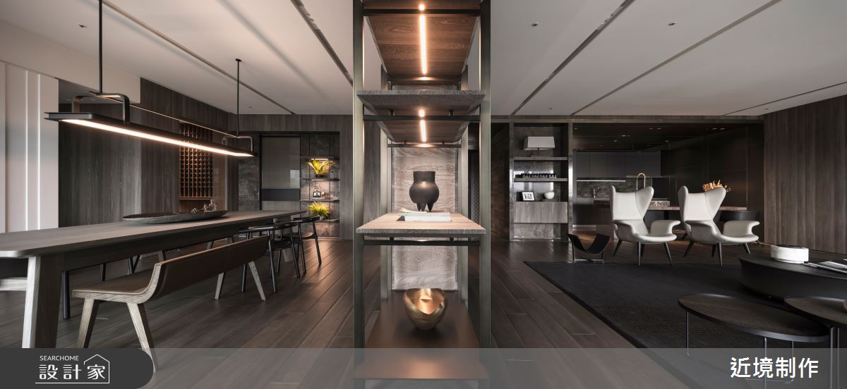 空間內,透過家具型態的電視主牆,強調其穿透性,並有效達到功能上的使用,而開放式的社交廚房,則延伸其客廳功能,讓使用情境得以轉化,在餐廳區的延伸以酒窖、中廚的設定上,滿足了全方位的機能型態;橫向布局軸線的另一頭,以主臥延伸書房更衣室為主軸,另一頭安排則為兩個女兒的遊戲室,並延伸至兩間獨立的臥房;設計語彙上,在開放區透過一道拱框的概念定義出玄關、吧檯 、客廳三種不同屬性連結的關係,利用材料的延伸,轉化出各種架構的空間整合,包含天花材質的層次、櫃體的轉折及解構燈具的安排!