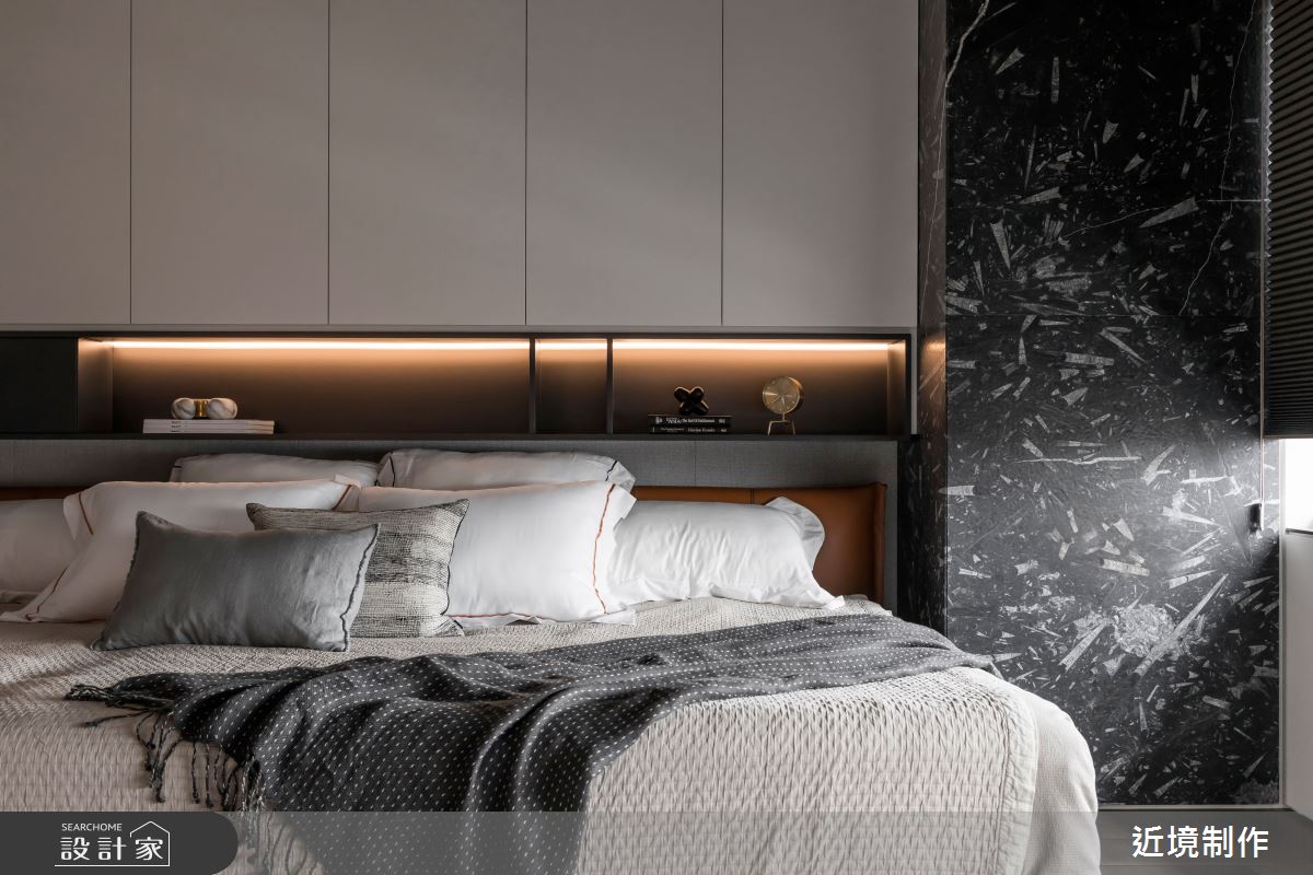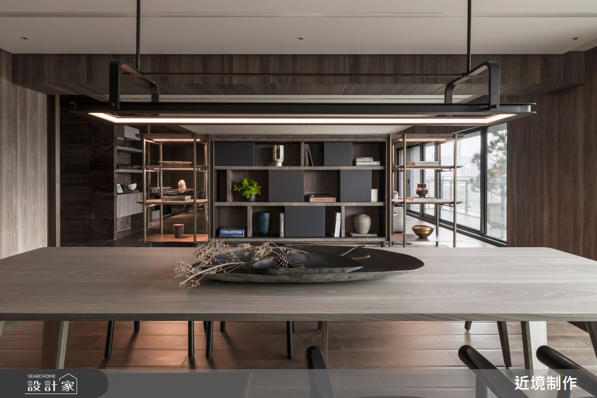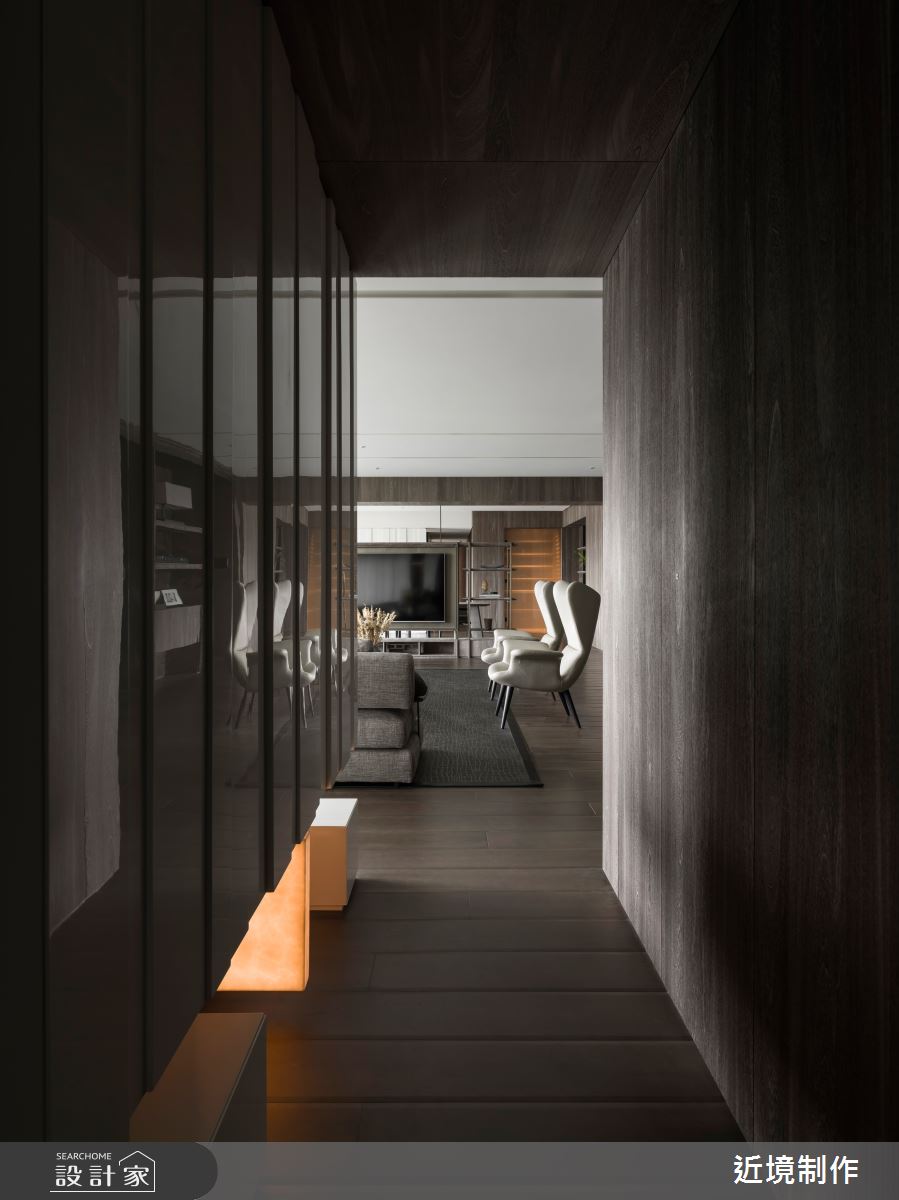 空間內,透過家具型態的電視主牆,強調其穿透性,並有效達到功能上的使用,而開放式的社交廚房,則延伸其客廳功能,讓使用情境得以轉化,在餐廳區的延伸以酒窖、中廚的設定上,滿足了全方位的機能型態;橫向布局軸線的另一頭,以主臥延伸書房更衣室為主軸,另一頭安排則為兩個女兒的遊戲室,並延伸至兩間獨立的臥房;設計語彙上,在開放區透過一道拱框的概念定義出玄關、吧檯 、客廳三種不同屬性連結的關係,利用材料的延伸,轉化出各種架構的空間整合,包含天花材質的層次、櫃體的轉折及解構燈具的安排!