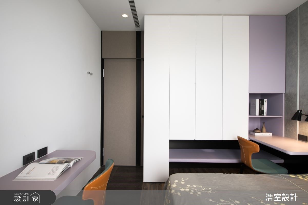 因應玄關斜角格局,設計師以深淺色地坪劃分場域,並運用天花垂直軸線引導視覺,消弭原有空間疑慮。而牆面的避震樑柱,則是採用世界地圖裝飾,為喜愛旅遊的居者創造生活夢想藍圖。客廳電視牆選用大面觀音石,以沉穩而自然的石材紋理,結合窗外山河景致,締造出大自然環抱的無價享受。天花則以「土星」設計概念打造光源,藉由極簡手法詮釋浩瀚無垠的遼闊天際。而餐廳壁面選用鍍鈦金屬點亮用餐氛圍。主臥天花加入深色鏡面元素,不僅反射戶外景觀倒影,更營造出精品飯店質感。