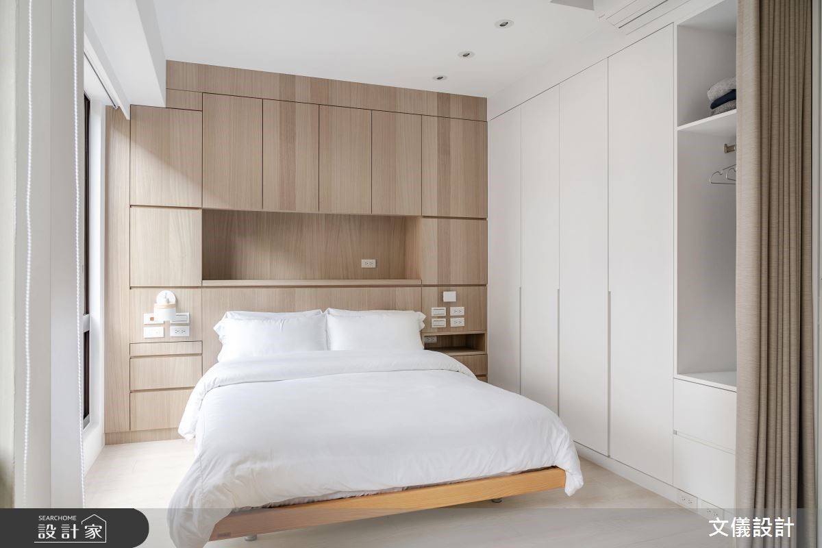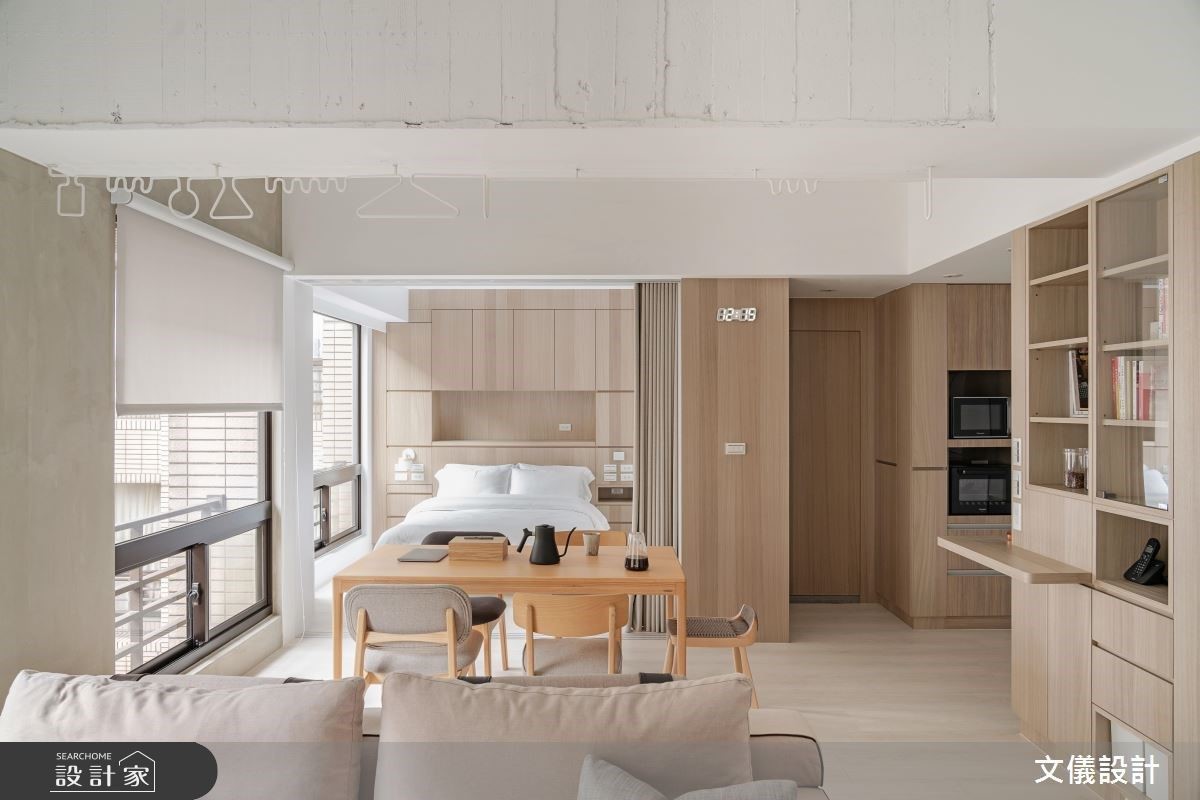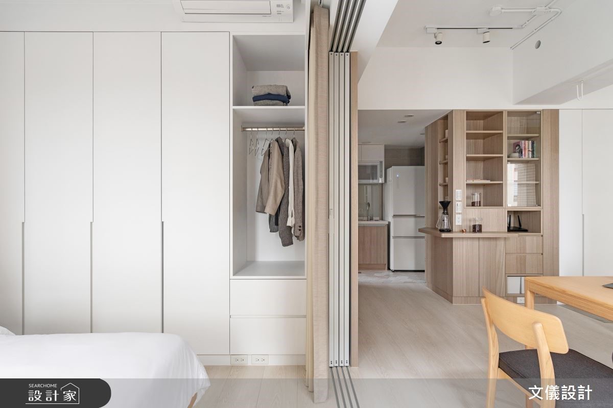 公、私領域之間屏除隔間牆,選用具有隱私感的玻璃拉門來保持空間的開闊感,讓兩場域皆擁有舒適通透好光線,需要休息時則將簾幕拉上,同樣保有良好的睡眠品質。另外,床頭與牆面側邊規劃完整的櫃體,帶給屋主大容量儲物空間,將小坪數發揮最大化,完整生活機能。