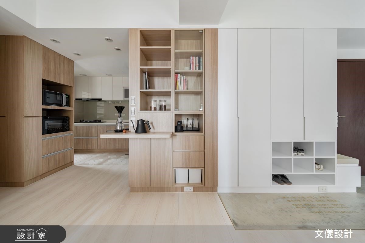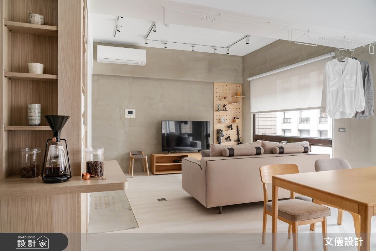 敞開大門,好採光與無印配色映入眼簾,帶來輕暖且舒服的放鬆氛圍。玄關處水泥粉光地坪刻劃著屋主喜愛的詩文,穿鞋、整裝時刻能細品文字,讓家有了歸屬感。開放的公領域牆面,透過木質與樂土的交錯應用,讓簡約溫暖的設計中感受出男子的生活品味;個性化洞洞板收納牆呼應著屋主個性,家電、收藏品則替空間創造了獨特視角。安排於沙發後方的大餐桌,可依屋主需求轉換為辦公空間,樑柱下方巧思安排一體成型晒衣架,修飾樑柱、帶入生活機能並成為趣味端景。坐落於餐廚之間的轉角收納櫃,注入小吧檯巧思,成為品咖啡的愜意角落,串起了位於角落的開放廚房與餐廳區的連結。