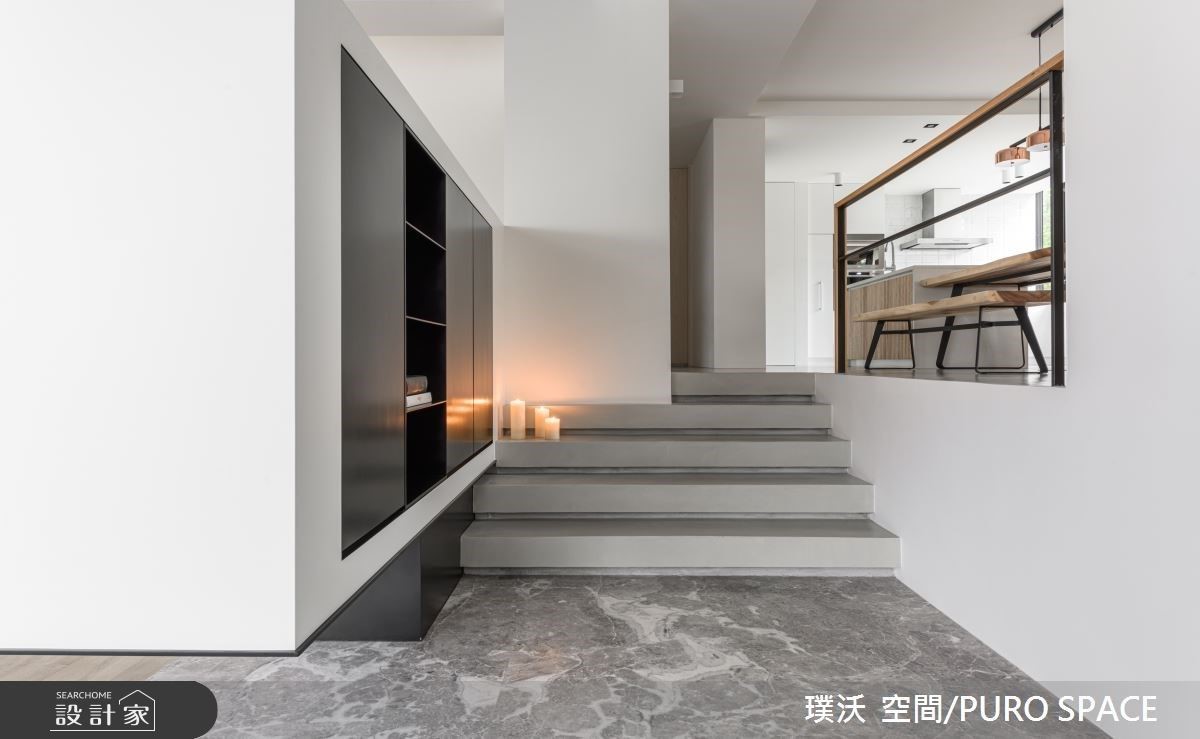 循階而上,電視牆背也相伴著風景,黑色層櫃於收納兼展示,讓坐於梯面也有隨手取書的方便。而轉身向右,是開放式的餐廚場域,客廳的木地板由此轉為無接縫自平水泥,退色肌理更有手感溫度,在原木家具下照映出更純淨的空間質感。
