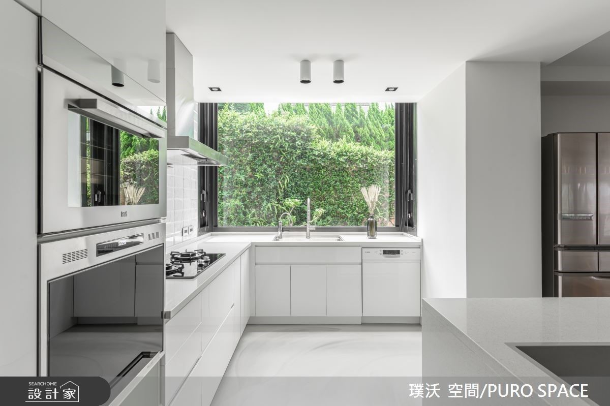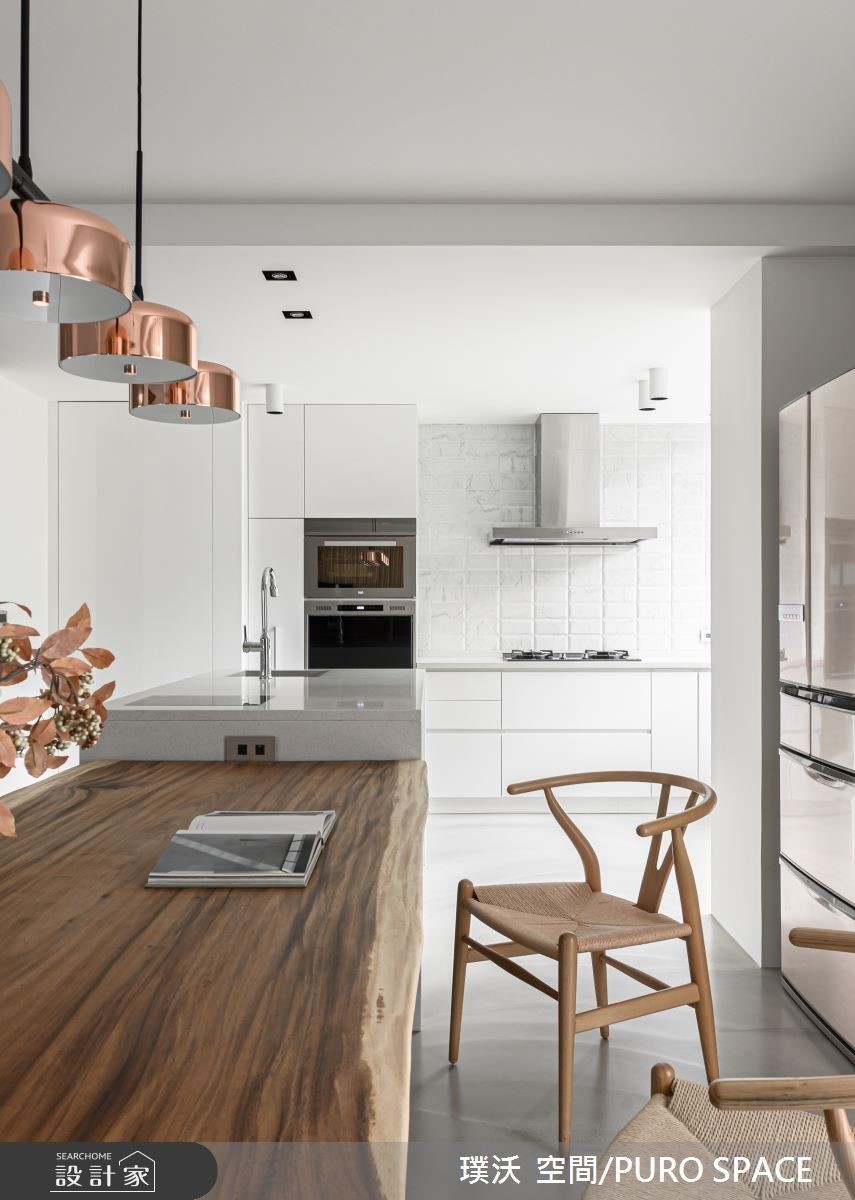 餐廳木作大牆,深刻密緻的垂直線性,質樸而有禪味,掛上電視就很有感。木牆又結合黑櫃,與黑鐵組構的原木餐桌凳相呼應,再搭白石嵌木色的中島,餐廳的暖度漸次轉進廚房的淨白冷調,但也據此凸顯一窗的綠意盎然,悠然而享料理之樂。