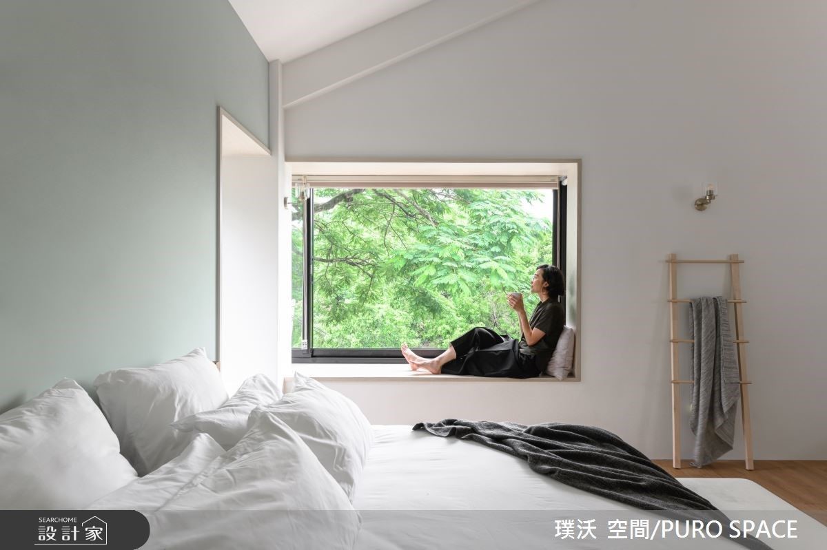 再上層樓,於主臥門前,停佇一方平台,一張沙發、一盆植栽,加上斜屋頂鑿出天窗灑落陽光,也是清歡有味。若是開門而入,裡外一樣素樸純靜,唯床頭牆刷上湖綠色,只為迎接轉角的L型窗台,如坐臥榻喝一杯清茶,迎來風吹樹暖的綠。