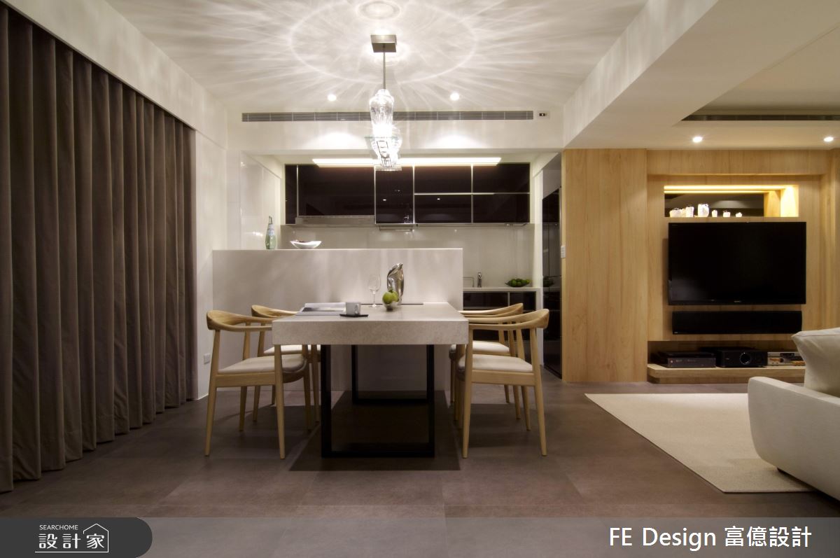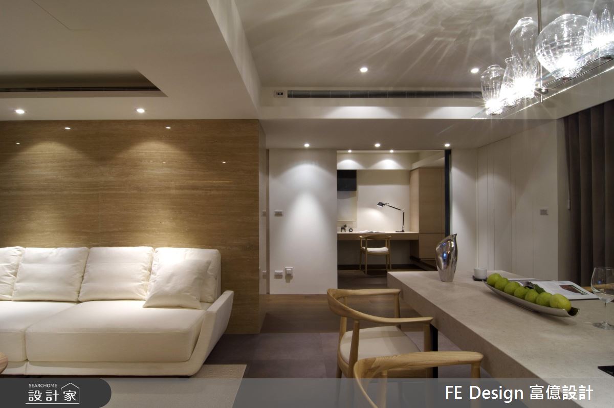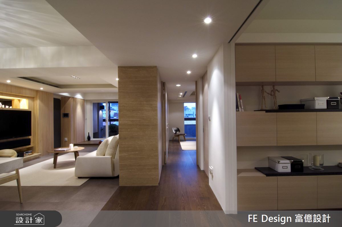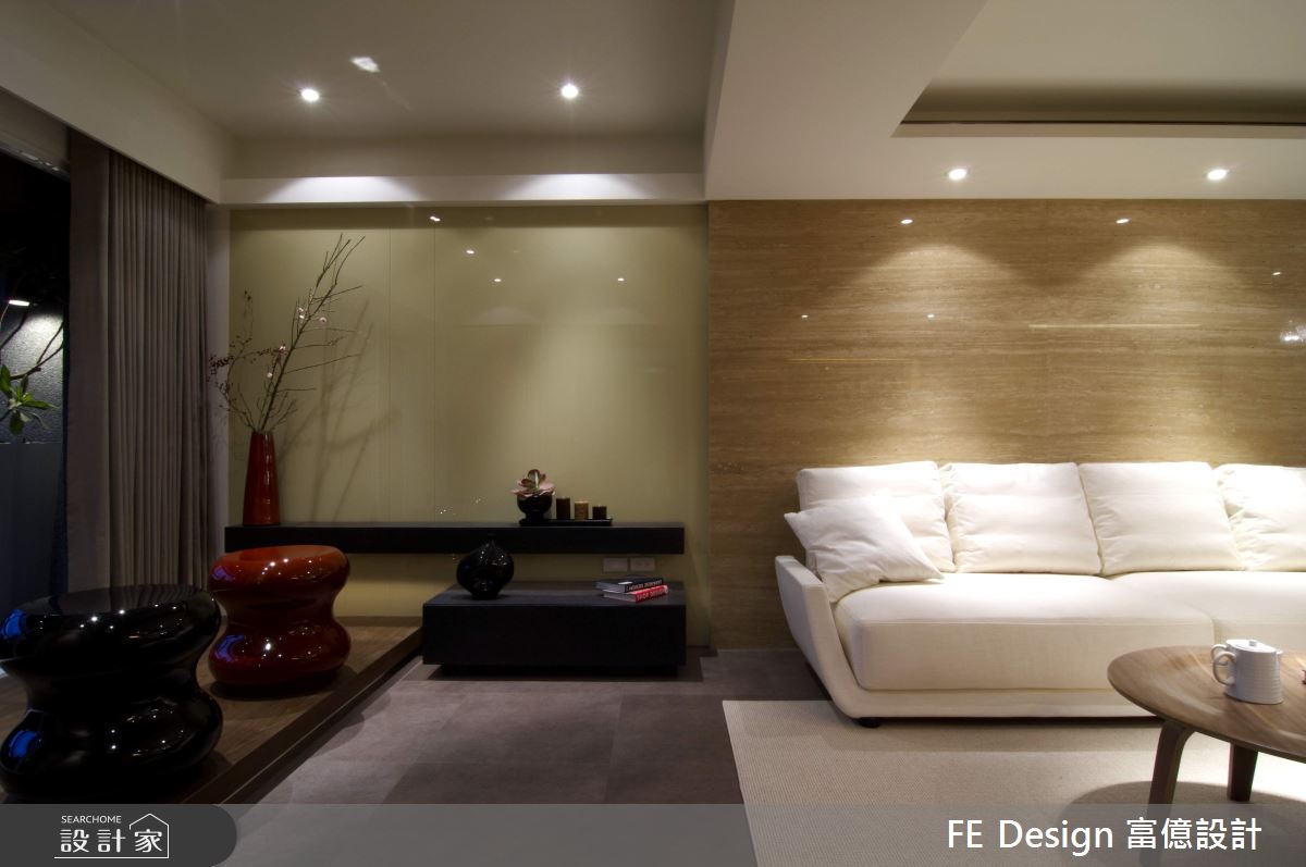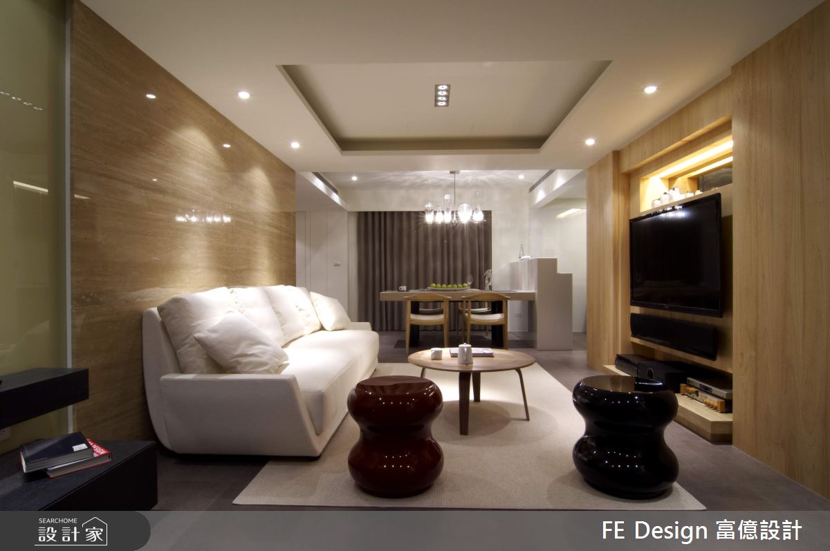 34坪老屋空間,設計師透過格局重整,將陽台內推、讓陽台的木地板延伸至室內架高木地板區,使空間產生放大效果,搭配簡約風的修飾,讓住宅機能與美觀兼具,快跟著小編一起來看看吧!客廳電視牆採鋼刷梧桐木鋪陳,休憩區壁面則以材質作呼應,帶出溫潤的紋路肌理,沙發牆則選用天然洞石打造,與主牆形成自然呼應;一旁規劃架
