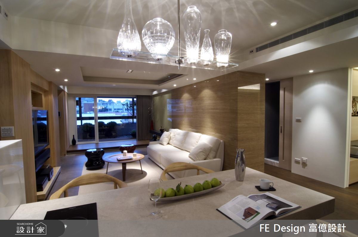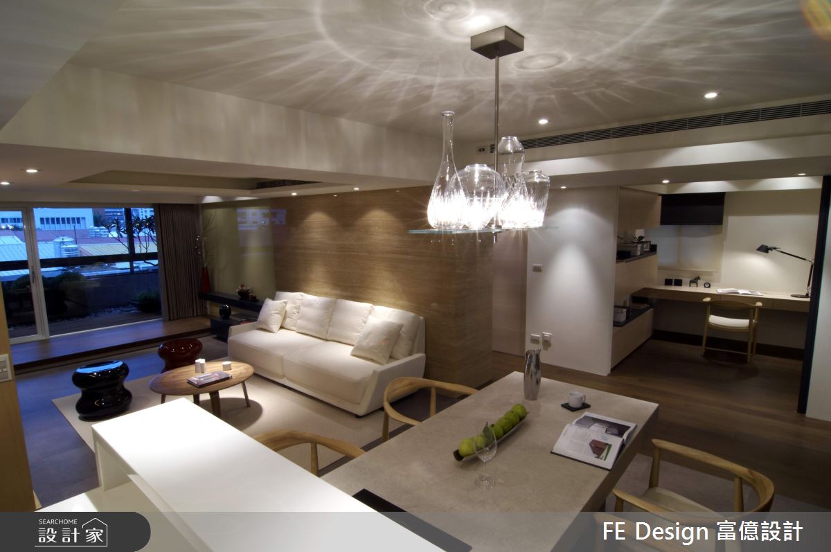 客廳電視牆採鋼刷梧桐木鋪陳,休憩區壁面則以材質作呼應,帶出溫潤的紋路肌理,沙發牆則選用天然洞石打造,與主牆形成自然呼應;一旁規劃架高休憩區,於立面加入鵝黃色烤漆玻璃,搭配家具做鮮豔跳色,並透過玻璃門片串起與戶外的連結,將陽台以內縮方式處理,創造空間尺度的延伸;餐桌天花則以燈飾形塑焦點,搭配酒瓶造型吊燈,在光影的渲染之下,折射出低奢的光影效果,讓餐區質感更加乘!