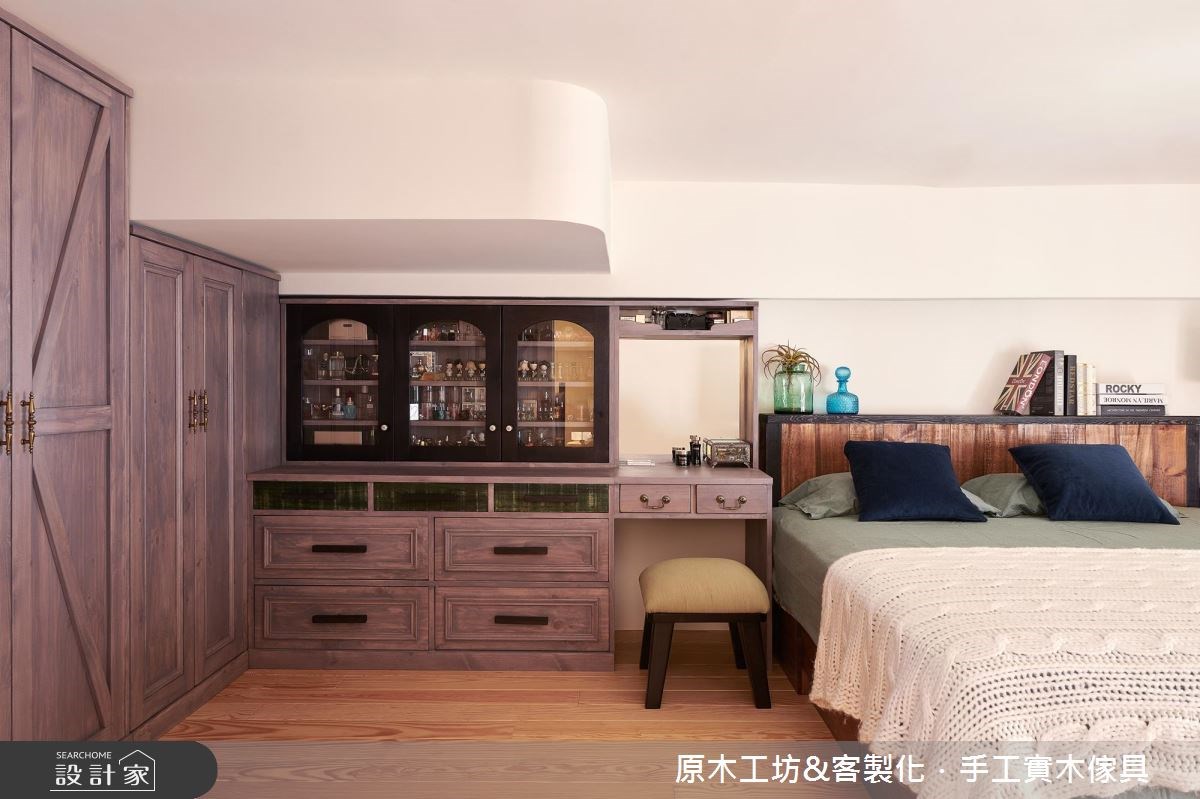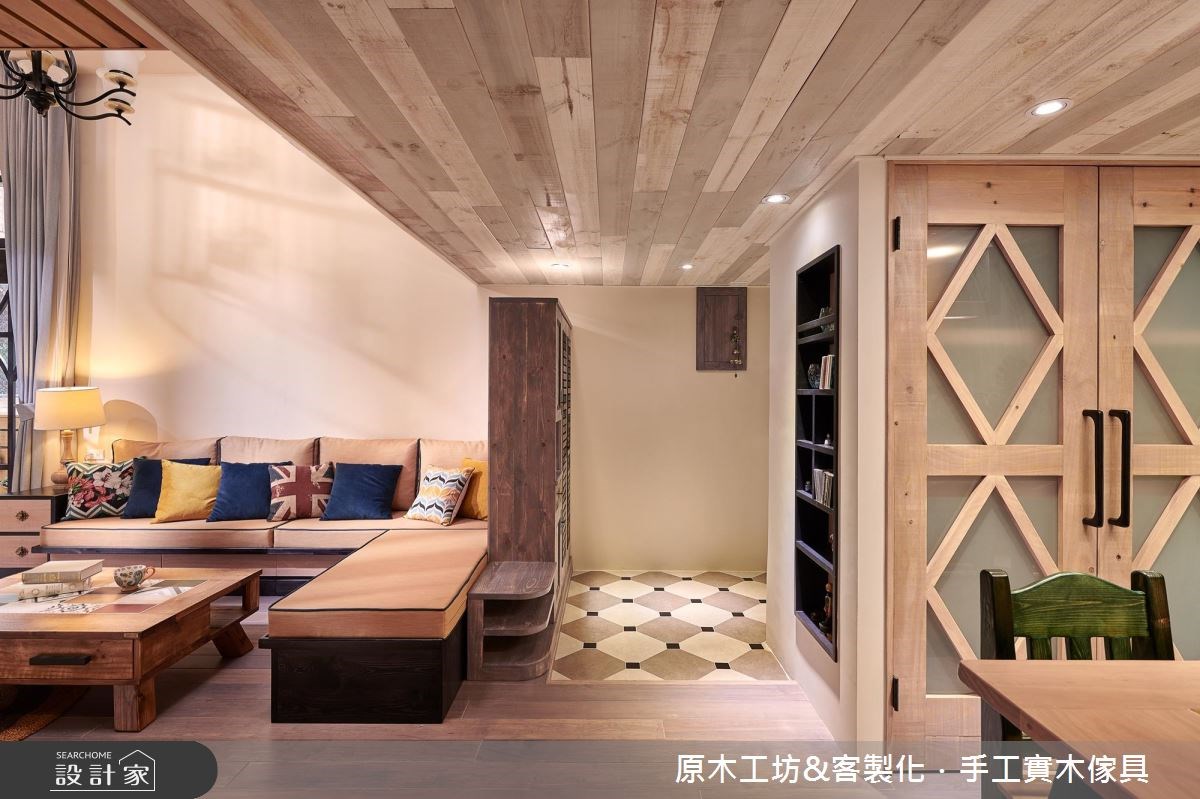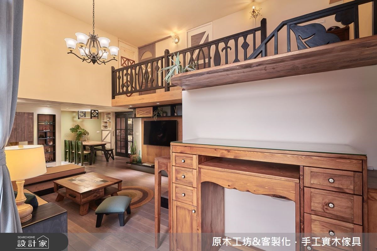 Home Data走過多年、35坪老屋裡,因濕氣重導致壁癌問題,挑高的樓層位子將入口光線遮蔽,造成室內陰暗;加上收納不足,許多生活物件散落在地板上。除了基礎工程的整頓,透過原木材質予以改造,透過鄉村風營造出溫馨的家屋氛圍,讓人愛上回家的感覺。