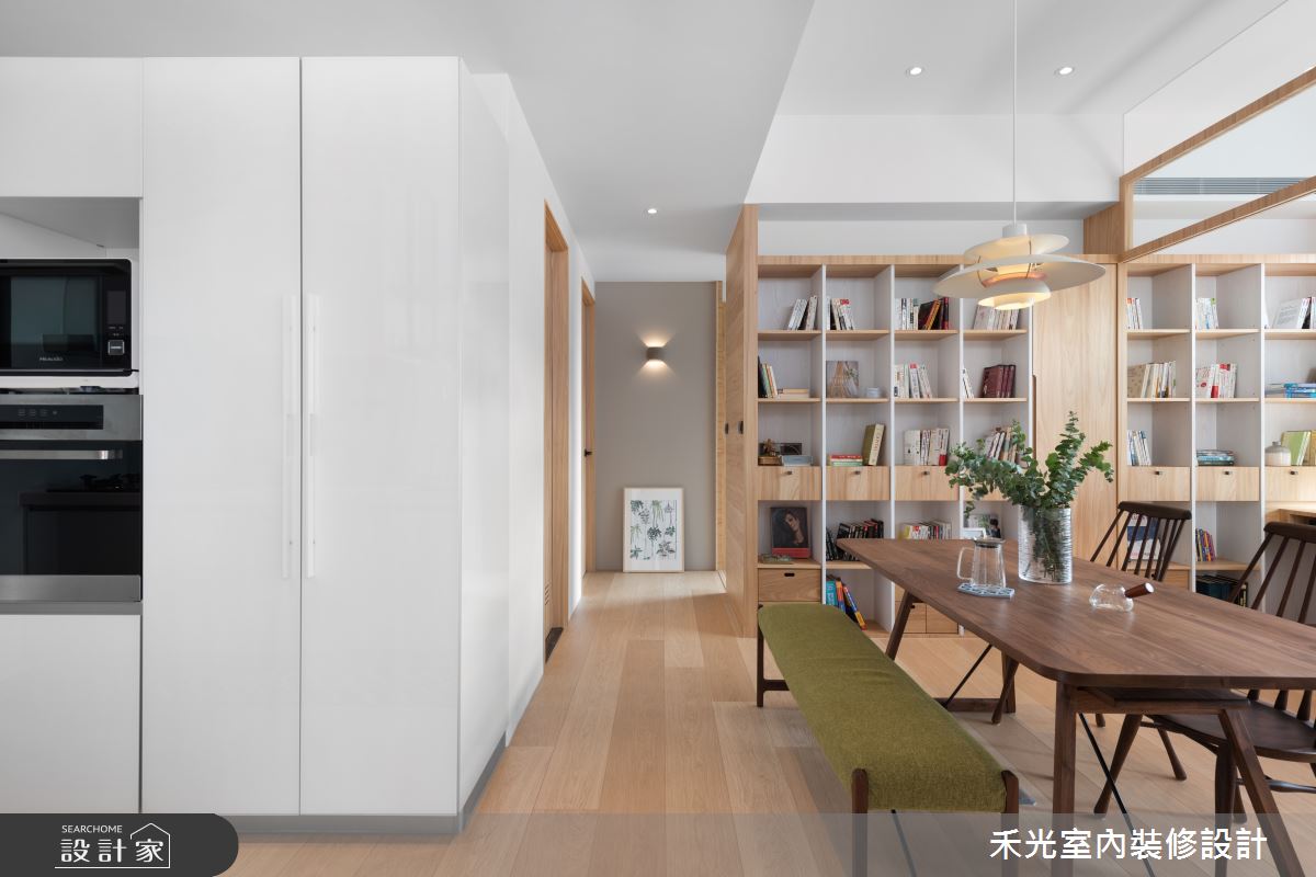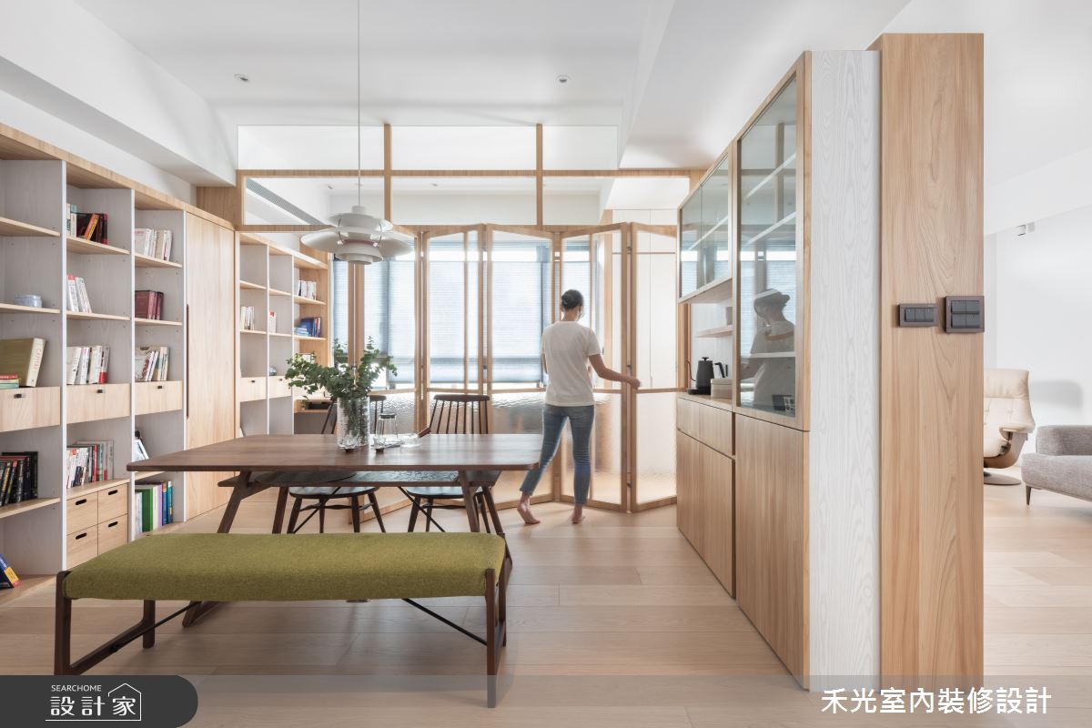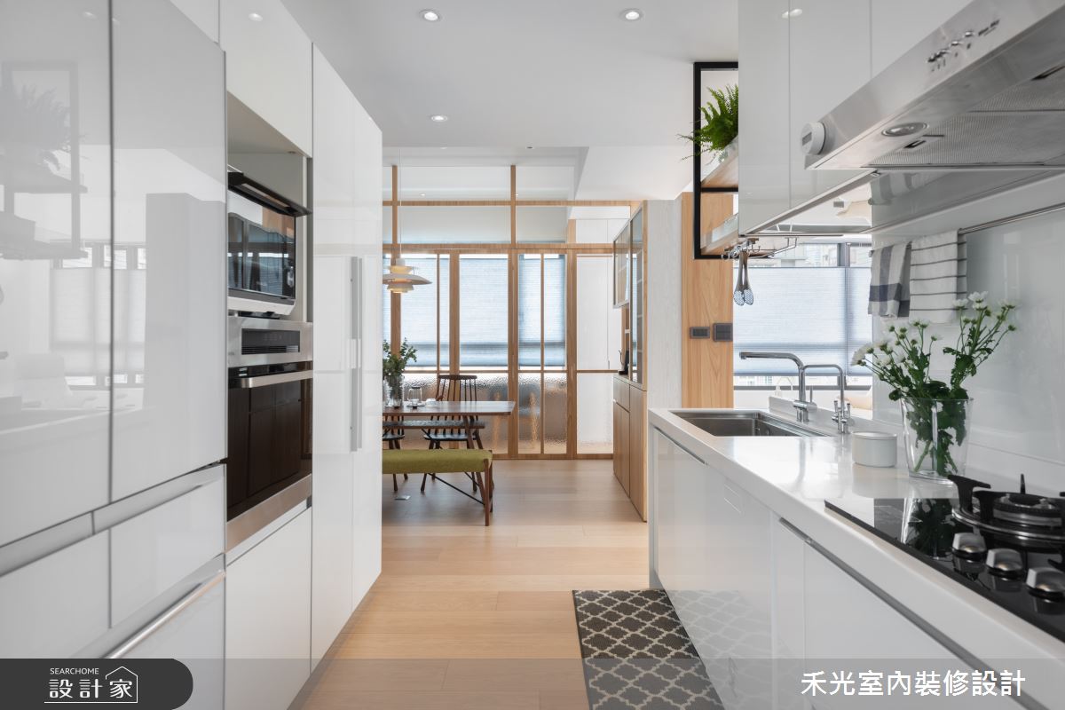 玄關區域,規劃複合洞洞板的鞋櫃設計,搭配地坪的材質轉換,界定出落塵區,另一側則作為沙發旁的展示牆,搭配趣味十足的生活小物,描繪豐富多變的生活樣貌。不做滿的電視主牆,背面結合餐櫃收納,巧以玻璃門片打造客、餐廳和書房的分野,營造輕盈通透感,讓生活動線更加彈性與順暢,輔以龜背芋、虎尾蘭、波士頓腎蕨等植栽點綴,營造自然綠意的居家氣息。書房旁側以大面積的格狀櫃體,降低壓迫感,搭配不同大小的櫃格與抽屜,在整齊一致的畫面中,營造富有變化的節奏感。走入餐廚區域,以純白色系的系統廚具,讓純淨無瑕的居家氛圍,瀰漫在寧靜美好的生活環境。