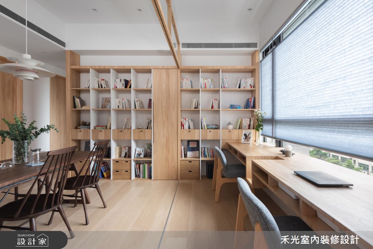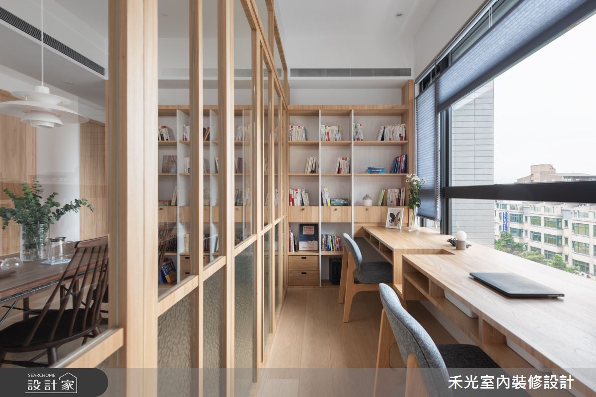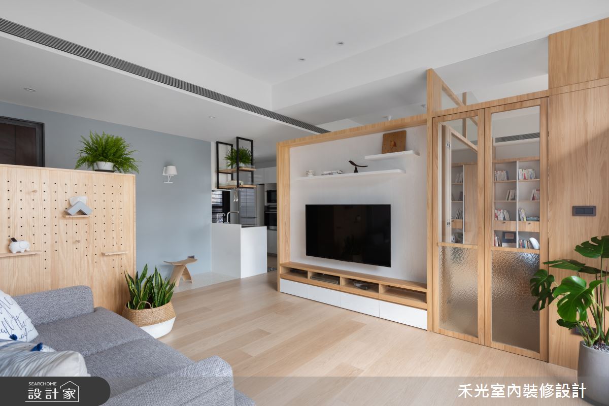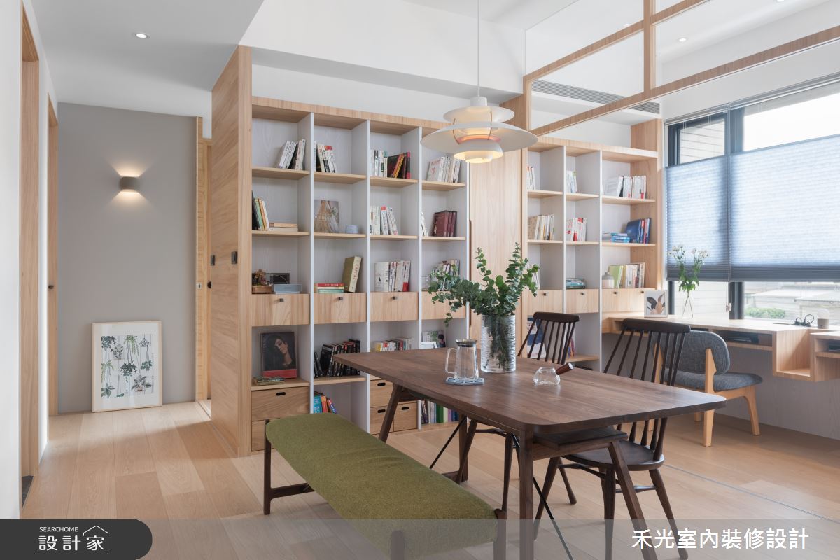 玄關區域,規劃複合洞洞板的鞋櫃設計,搭配地坪的材質轉換,界定出落塵區,另一側則作為沙發旁的展示牆,搭配趣味十足的生活小物,描繪豐富多變的生活樣貌。不做滿的電視主牆,背面結合餐櫃收納,巧以玻璃門片打造客、餐廳和書房的分野,營造輕盈通透感,讓生活動線更加彈性與順暢,輔以龜背芋、虎尾蘭、波士頓腎蕨等植栽點綴,營造自然綠意的居家氣息。書房旁側以大面積的格狀櫃體,降低壓迫感,搭配不同大小的櫃格與抽屜,在整齊一致的畫面中,營造富有變化的節奏感。走入餐廚區域,以純白色系的系統廚具,讓純淨無瑕的居家氛圍,瀰漫在寧靜美好的生活環境。