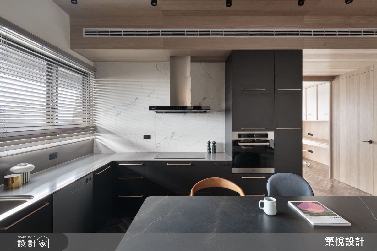 這個28坪的家,屋主夫妻希望能擁有通透明亮室內輪廓,因此在格局配置上,設計師讓開放式的客、餐廚與書房分別至於空間的兩端、彼此對望,讓公共區域得以串聯、空氣流通,同時增加空間的深度。天地壁的設計上,純粹不複雜,鋪上復古色彩的人字拼木地板,創造視覺變化及環境溫度,橫亙天花的大斜樑,經過精密的計算,略為壓低並包覆後,與大理石電視牆、機櫃、冰箱和黑鐵鏤空展示櫃結合,無形之隔、化解建築既有的缺憾、少了實牆的限制,卻也定義客廳與餐廚區域,讓居住者優游其中,享受時刻美好。