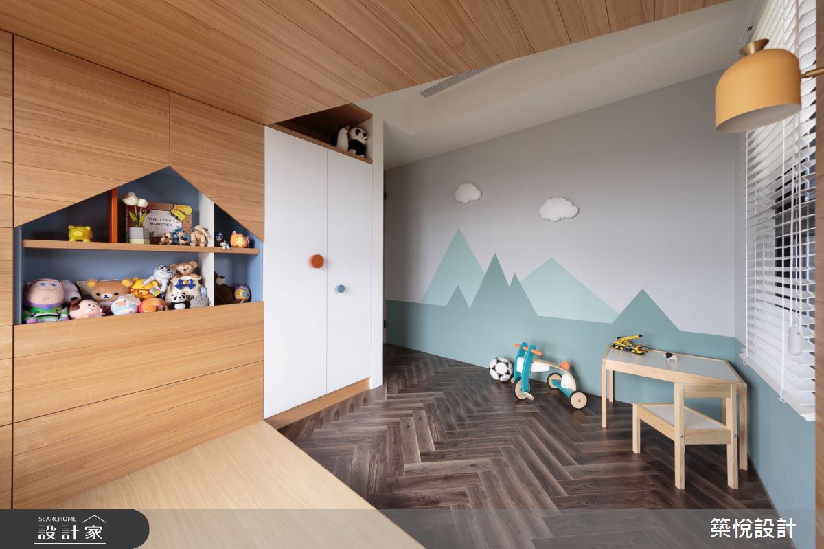 主臥空間則揉合了藍色系牆面,轉化及突顯場域的層次變化,舒適、簡約的家具陳設,通過質材、布藝的配搭,給人不失精緻度的放鬆氛圍;小孩房加入了童趣元素,像是彩繪壁面及房子形狀的鏤空收納櫃,兼顧機能與主題。
