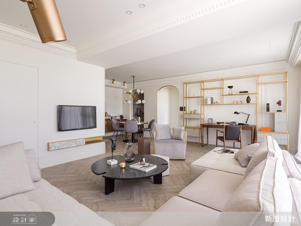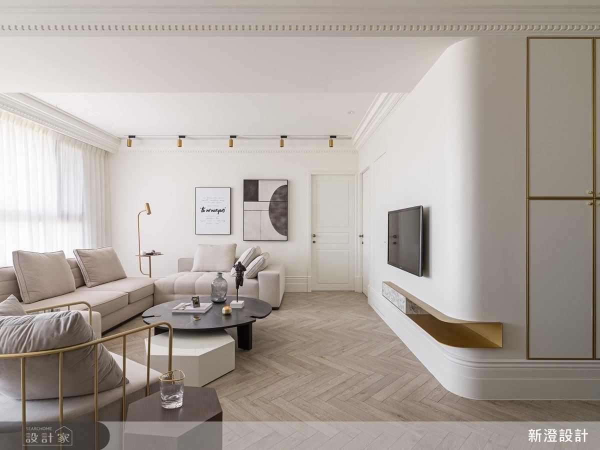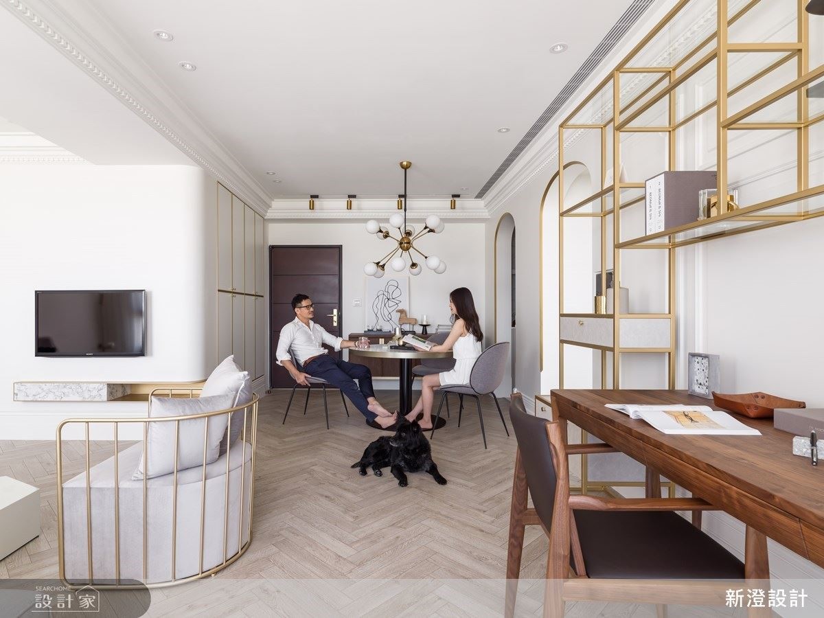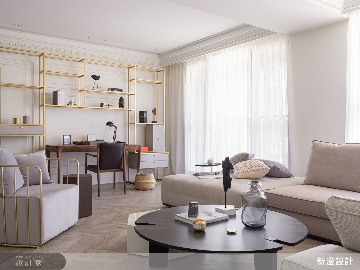 入口鞋櫃採金色邊條收邊,與鐵架書牆的色彩互相呼應,而且 60 公分的深度,更足夠規劃為雙層鞋架,增加收納。牆面以導圓角度銜接電視牆,寬度原本不足,刻意用隱藏門手法納入客廁門片一體成型,藉以擴大寬幅,更顯大氣;下方則以挖空的圓弧設備機櫃增添造型,卻同樣以金色維持色彩的一致。客廳則佈置極具現代感的低矮沙發,雲朵般的縫線,讓人可以舒適的躺著看電視,