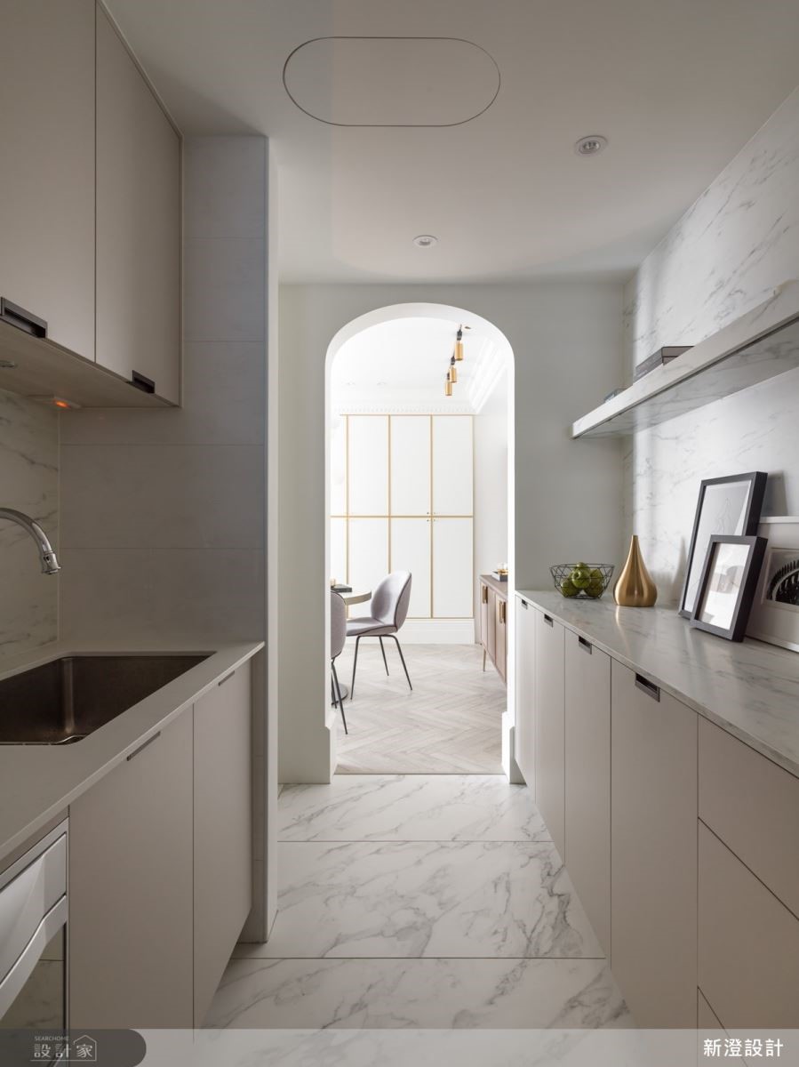 原始格局三房相鄰,中間多出陰暗走道,也造成客廳狹小,電視牆則在現今書牆位置;設計師拆除一房隔間後,原本只與餐廳串聯的客廳,得以向另一側位移並且因為納入原來的走道而更為寬敞,也讓電視牆轉向到更適宜的地方。通往主臥與廚房的入口,則以門拱方式呈現,立面對稱性與比例分配的美感更佳,進主臥也多了轉折空間。