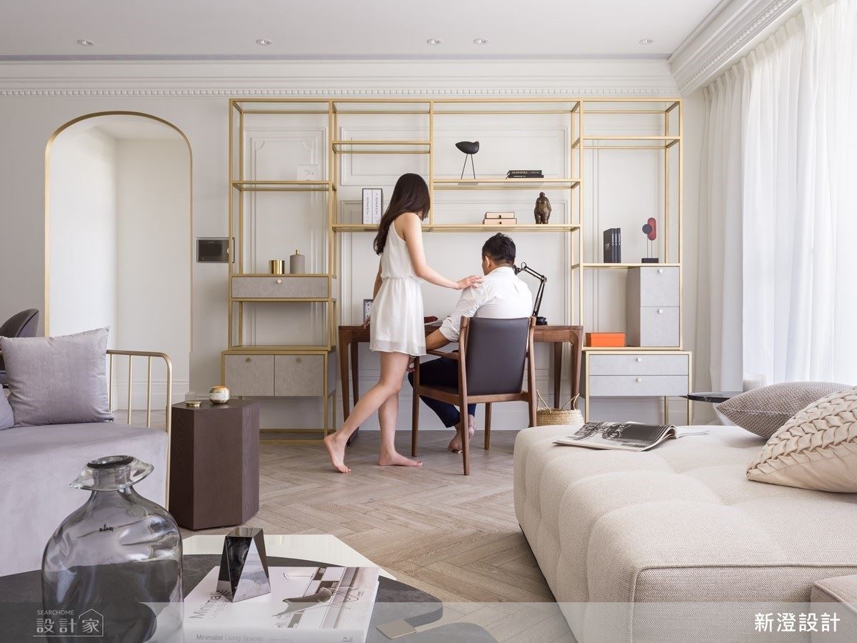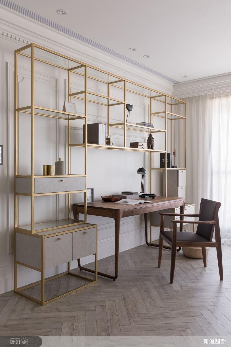 澄淨的空間,以具有溫度的暖白色澤油漆鋪墊,刻意添加了金屬色彩,清新卻不冰冷,也讓空間明度更加提亮而豐富,不但輕爽舒適,更顯帶著華麗的質感。最吸睛的就是牆面的金色烤漆鐵架書牆,大小不一的層架,虛實的開放層架與抽屜櫃體,滿足不同的收納與展示機能,下方中央的留白則能彈性運用,原來是規劃擺放女兒的鋼琴,即使設置書桌也不違和。