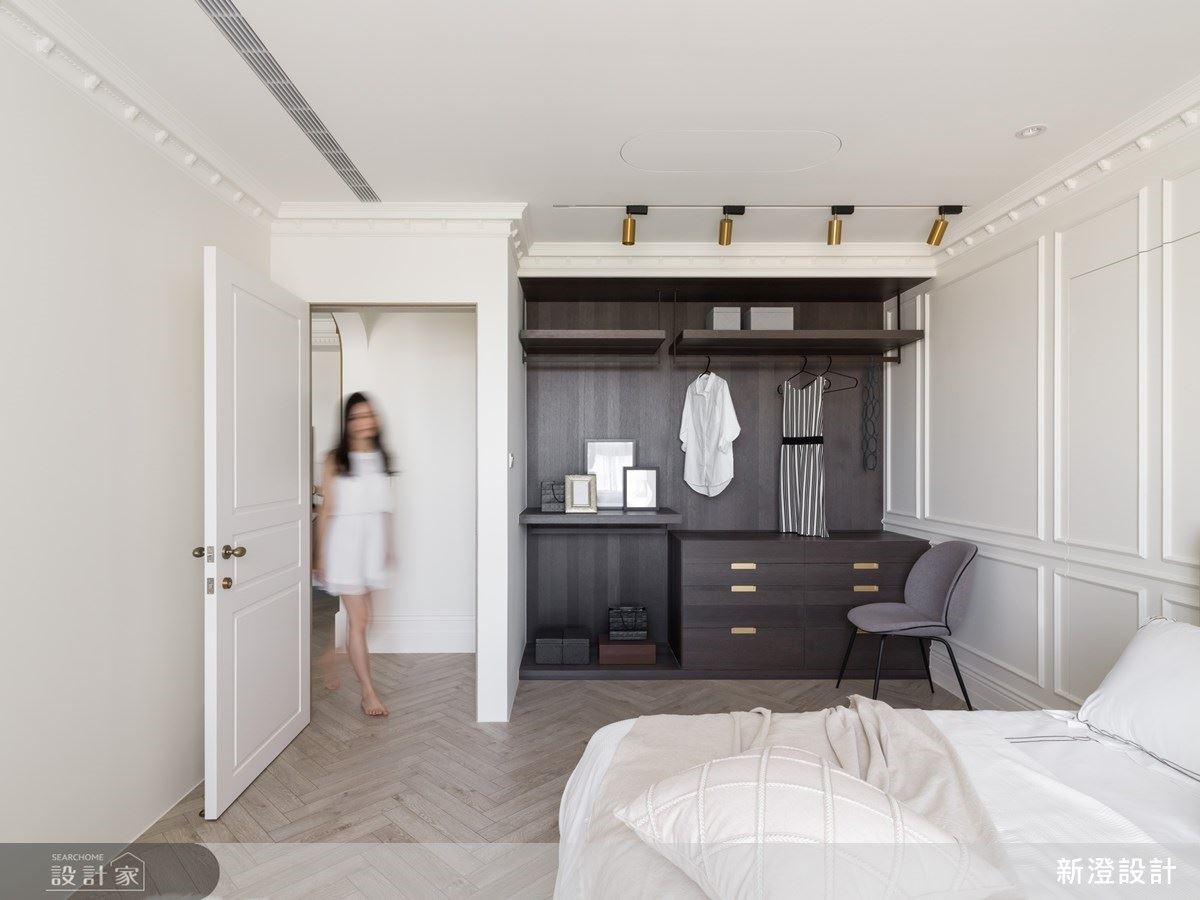 主臥同樣以隱藏門掩藏主衛浴的入口,深色搶眼的衣櫃可吊掛可收納,卻刻意不做門片,讓空間不受擠壓,動線更開闊。