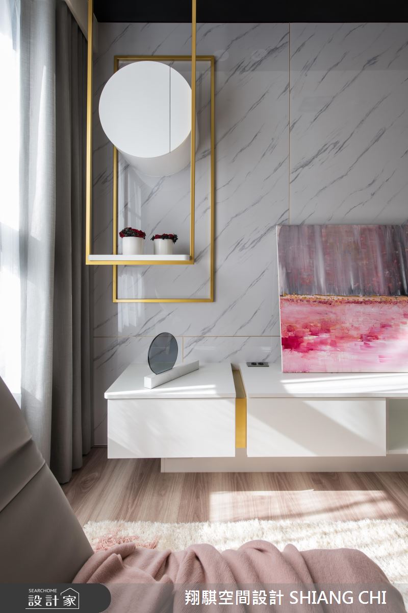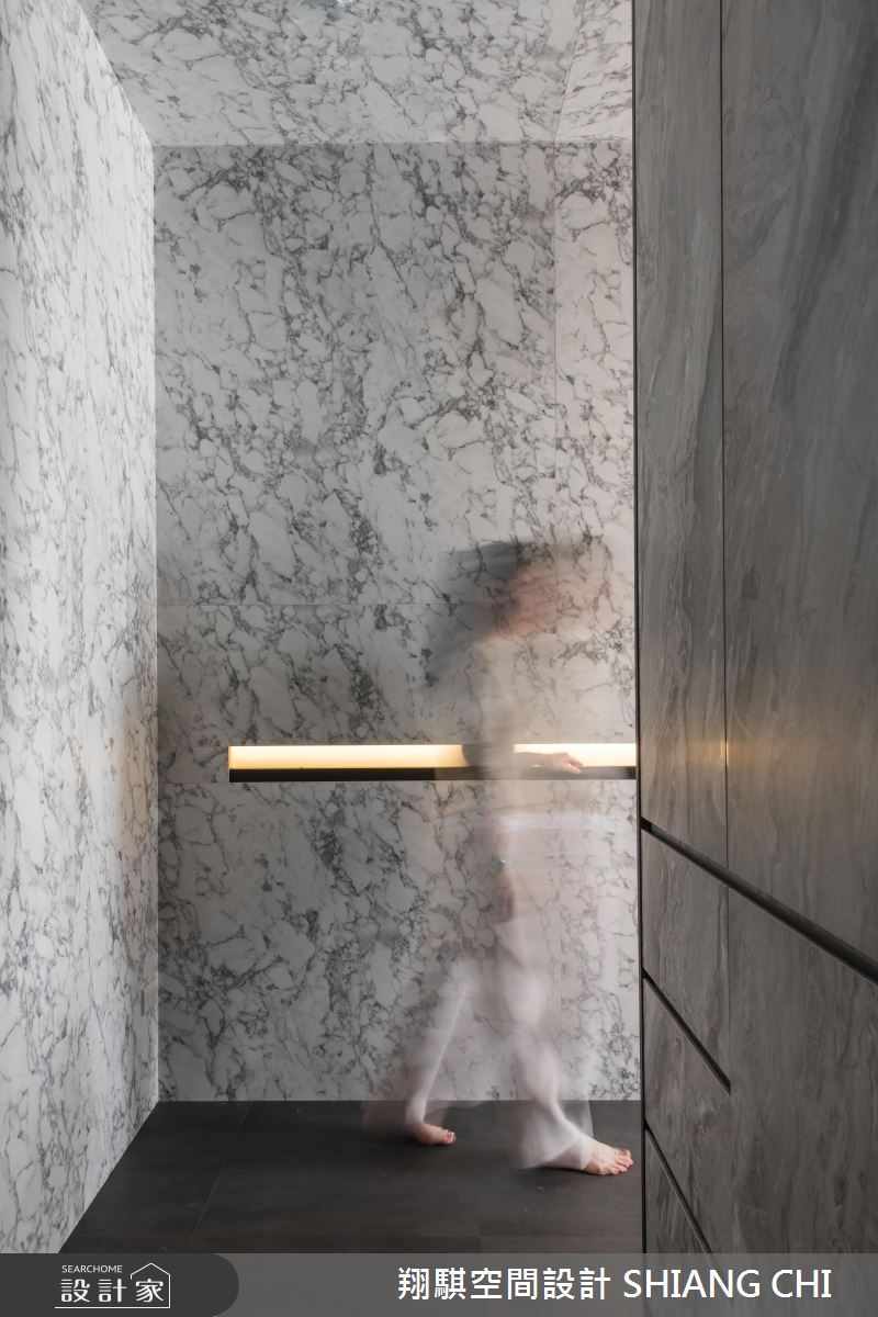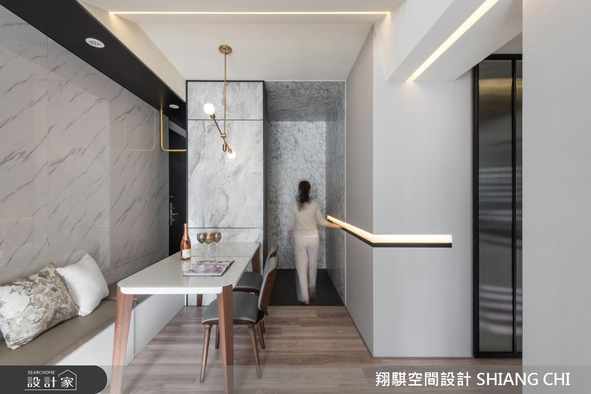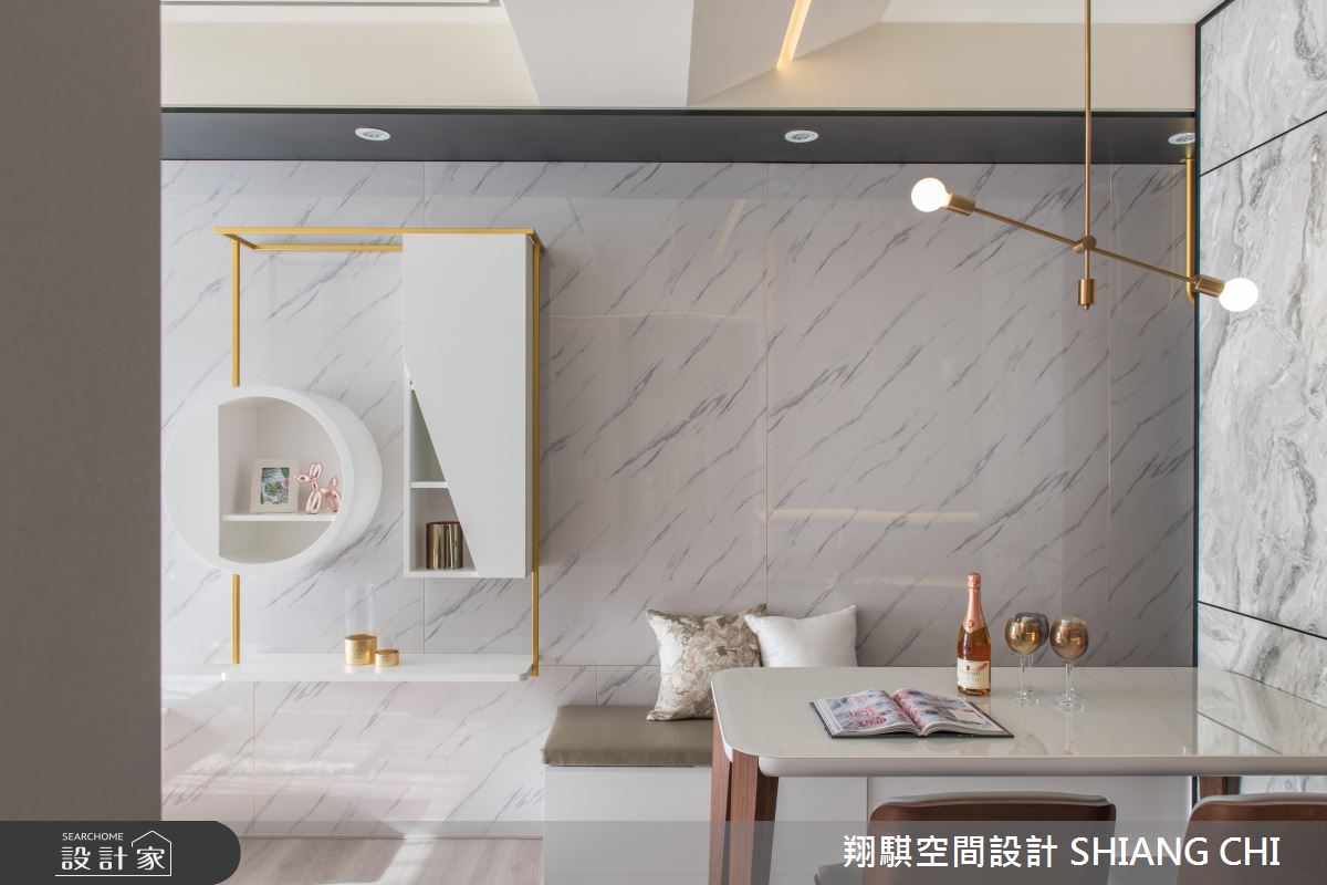 設計師拆解每個需求,達到空間、功能、光源三方共享,入門端景以若有似無的隱形扶手結合燈光導引,顛覆傳統居家面貌。並藉由全方位設計思維,將各種設備化為無形,同時引用石材藝術帶入公共空間,以細緻的石紋包圍視野,整合高級的金色元素與間接黃光,減少空間的冰冷感,展現時尚家居美學!