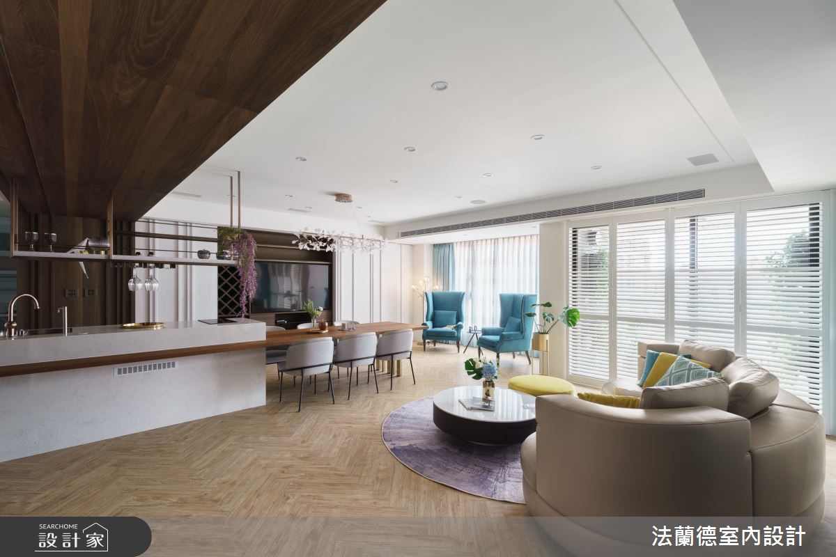 50坪的新成屋在還是毛胚房時,便委託設計師進行客變規劃。考量到居住者好客的個性及各種使用習慣,在格局規劃上首重家的「凝聚力」,進門後由一座超大型的中島吧檯成為空間的核心物件,而一旁則是由弧形型沙發及兩張主人椅構成的客廳區域,客、餐廳兩者的開放串聯,讓整體環境備感開豁,而家具的擺放型態,讓餐桌取代電視牆成為空間中心,促使親朋好友們能待在這裡一起互訴心事、充滿各種美好的可能。