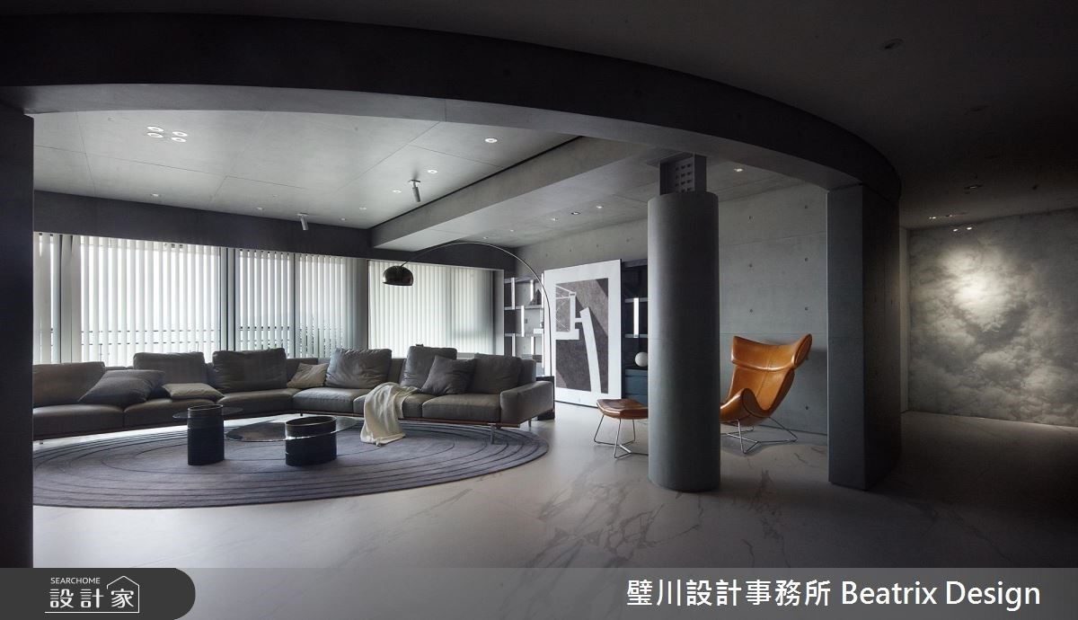 在男屋主對水泥的熱愛下,設計師以安藤忠雄建築師的設計作品為參考模型,將建築感融入室內空間,締造極簡而雄偉的磅礡巨作。客廳不僅運用弧形虛牆界定空間,一旁更打造大型圓柱,以一氣呵成的曲線與視覺張力,劃下宏偉而簡約的建築美學。因應女屋主柔和個性,公領域一旁的端景牆則規劃白色雲朵牆,藉由特殊塗料、石材紋理呈現白雲般的流動筆觸,產生衝突性視覺美感與趣味。