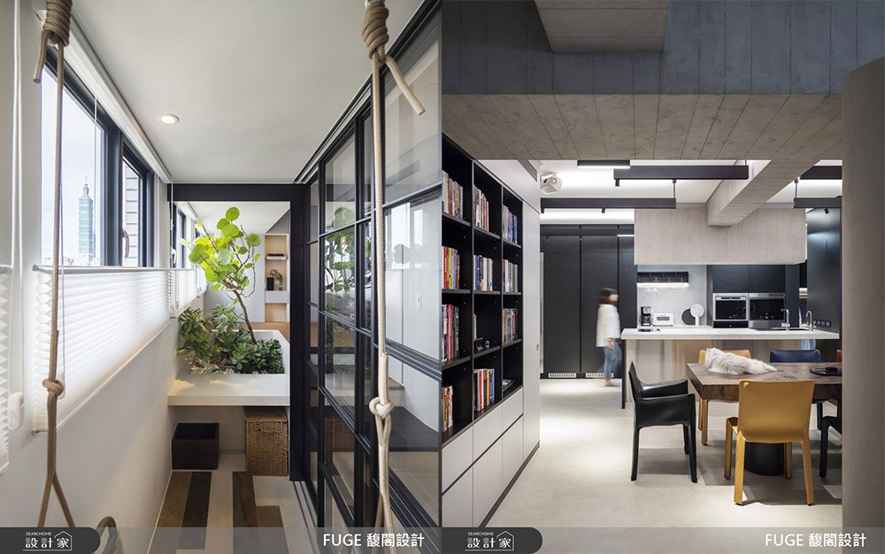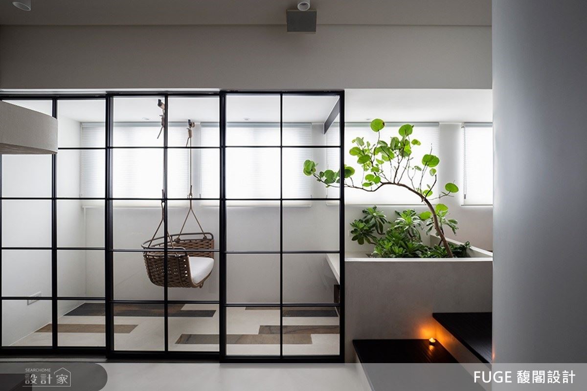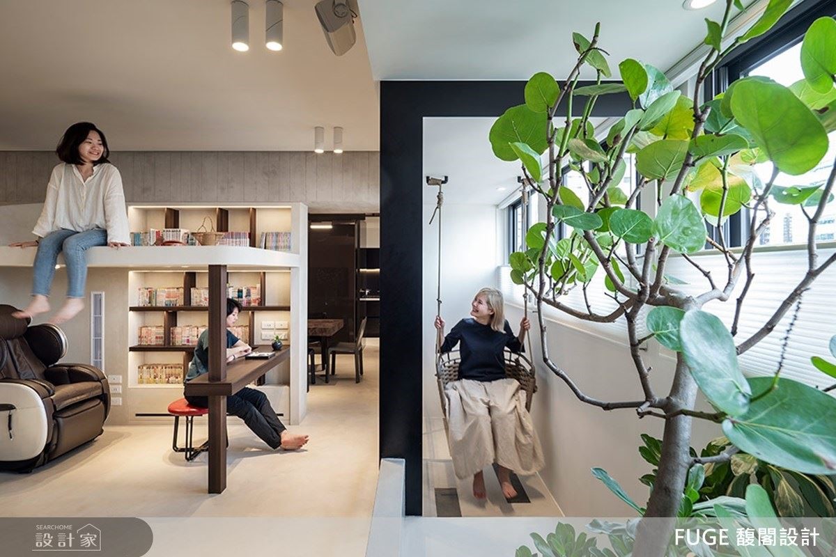 將原本臥室全數打掉後改善室內光照,並藉由玻璃拉門打造一座室內的陽台空間,良好採光弱化了樑下僅210公分的壓迫感,加上一張鞦韆椅,搭配端景綠色植栽,充滿童心的設計,滿足唐綺陽對於陽台的渴望。原本可能閒置的畸零空間透過架高設計化身為小和室,高於地坪的區域除了收納功能,還增加了些許獨特與隱私性。榻榻米區域是熟識友人專屬的談心天地,搭配升降桌設計後又是一個能滿足唐老師喜歡席地而坐、安靜寫作思考的小天地。