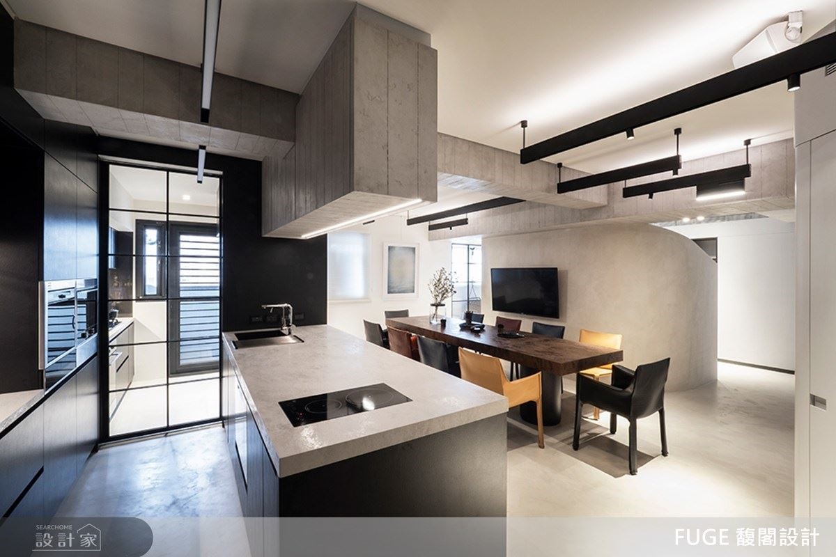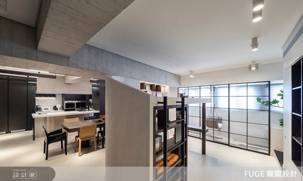 餐廳長桌是直播工作時的主要場域,但卻仍然保有完善的餐廚機能,從前端的開放式輕食中島到玻璃拉門後方的熱炒區,在工作與生活的所需條件下找到最佳平衡點。隱藏在弧形電視牆背後的區域設定成住宅私領域,電視牆前方的長桌於工作時可以是直播主場景,於私生活則為親友團聚交流的場域,獨特的開放式設計又能與中島吧檯的人互動,詮釋各場域相互連接又能各自獨立的設計。包覆感極高的小半樓提供穴居氛圍的安全感;有綠意、陽光的內縮陽台能完全放鬆自我,和半開放和室臥榻三者交會,形塑出居家生活親密對談、陪伴與獨處的環境。