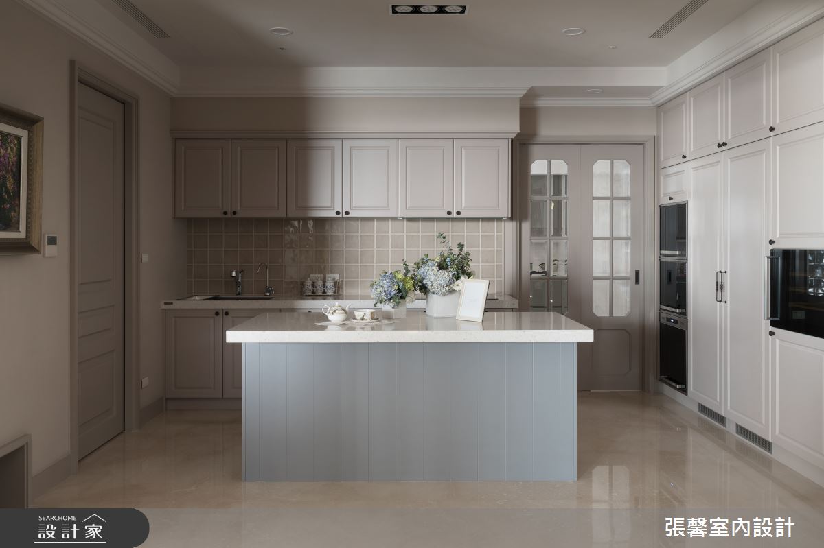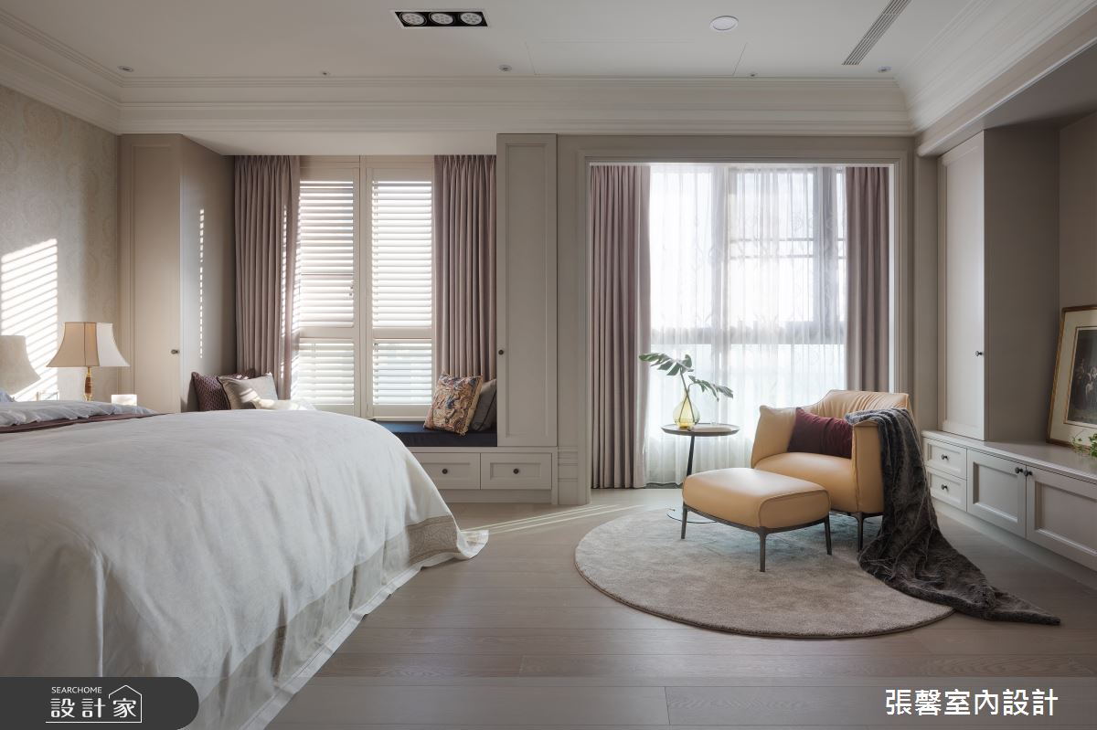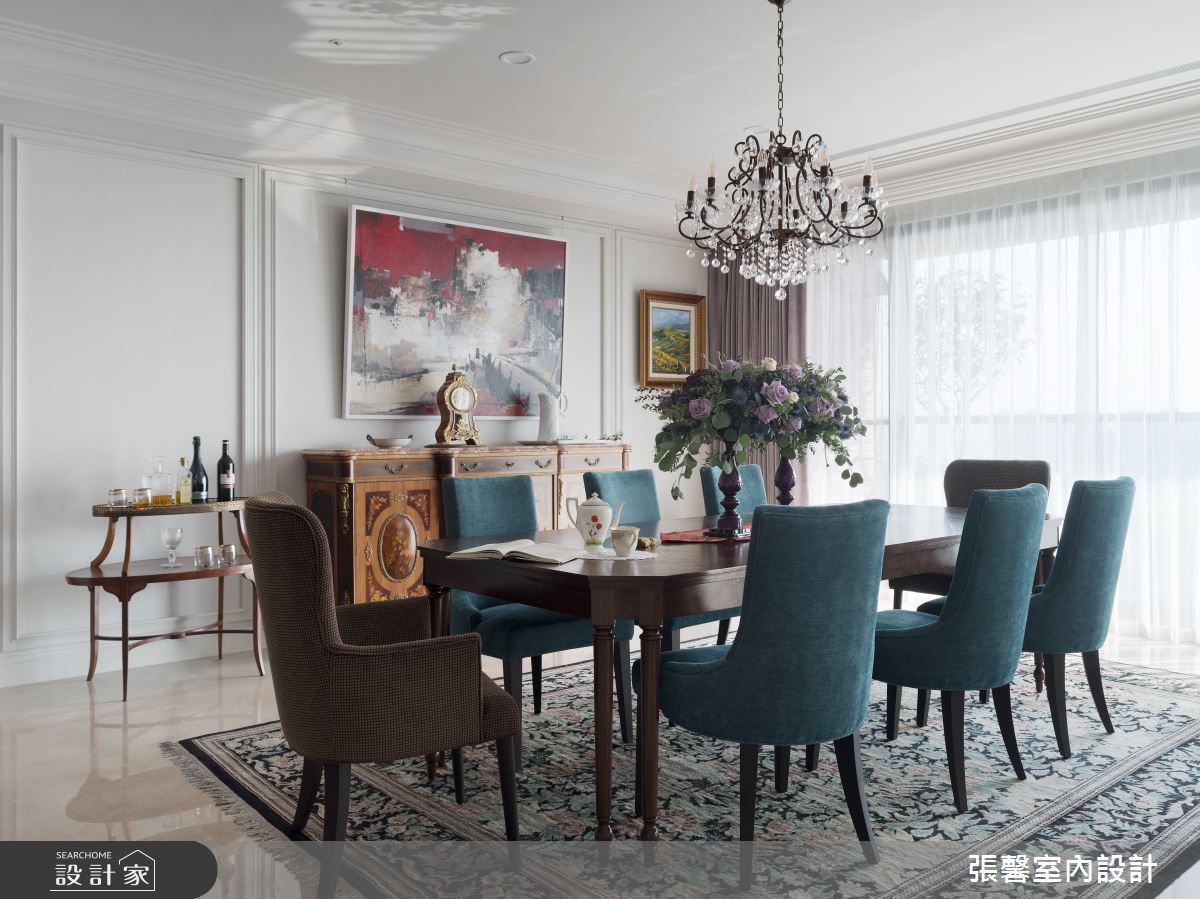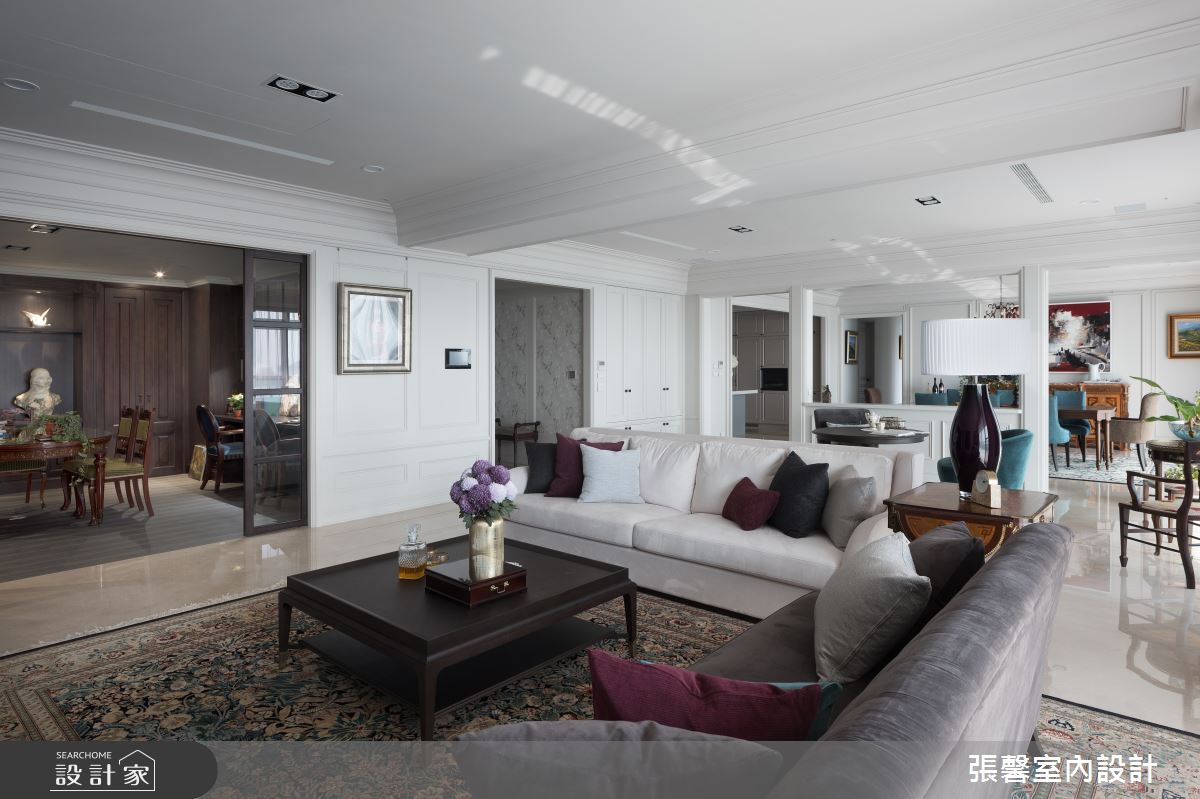 開放式的公共空間分為三區,從寬敞的玄關走入室內首先看到多功能區,在這裡可以會客也能享受悠閒的下午茶時光。右手邊為客廳區,以簡約的美式線板勾勒出淡雅氛圍,深淺色的沙發與大面積雅緻地毯則增添空間層次,另一側位於客廳同一水平為餐廳,擺上一幅畫作,不僅是餐廳風景也使話題開端。私人領域也是延續空間的白色調,搭配截取歐美古典元素的壁紙與點綴的粉色完整塑造優雅氣質。