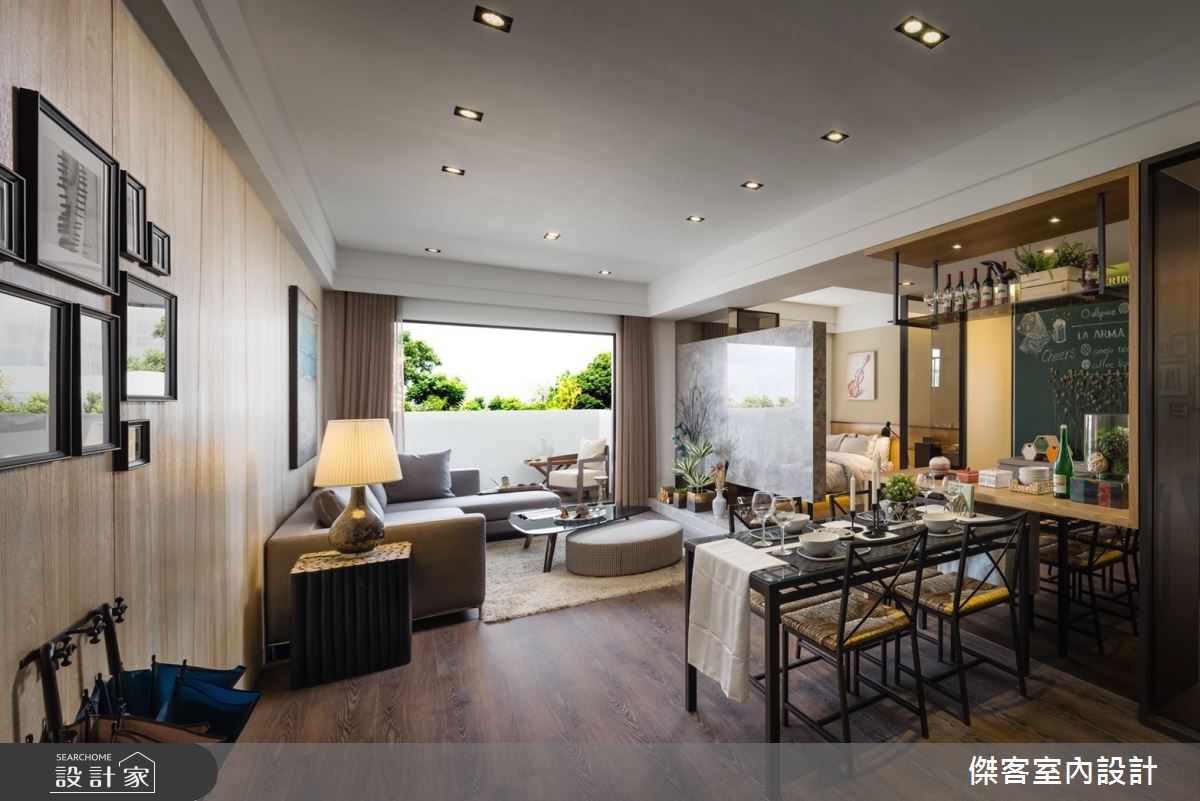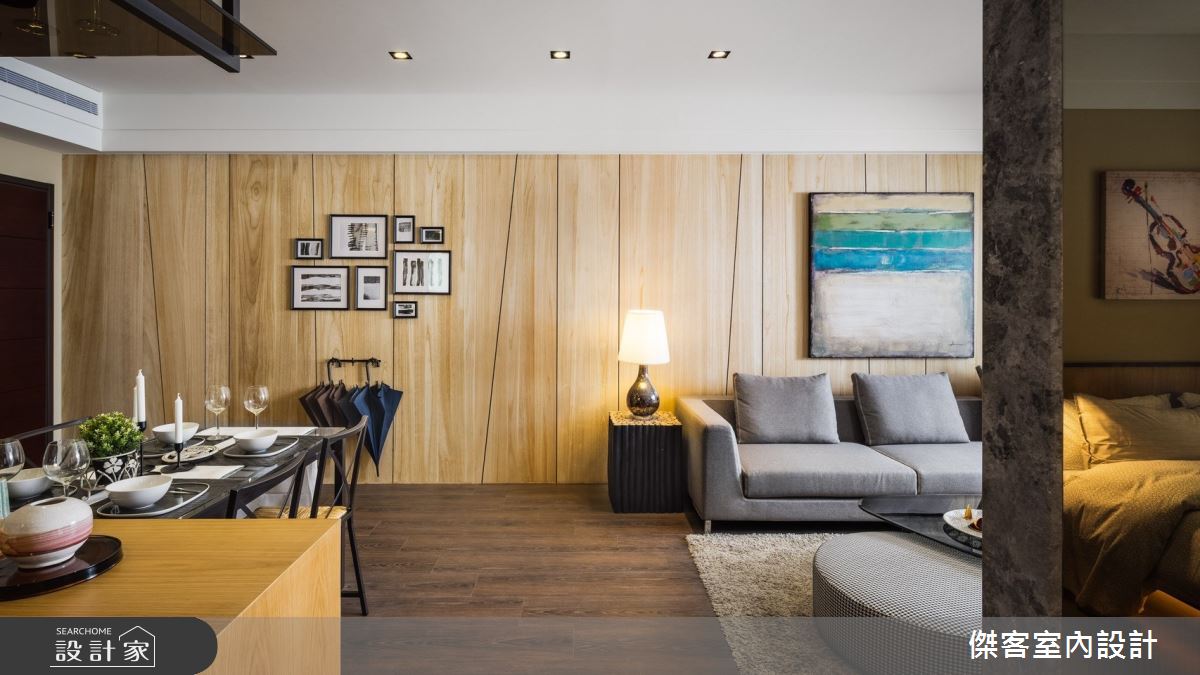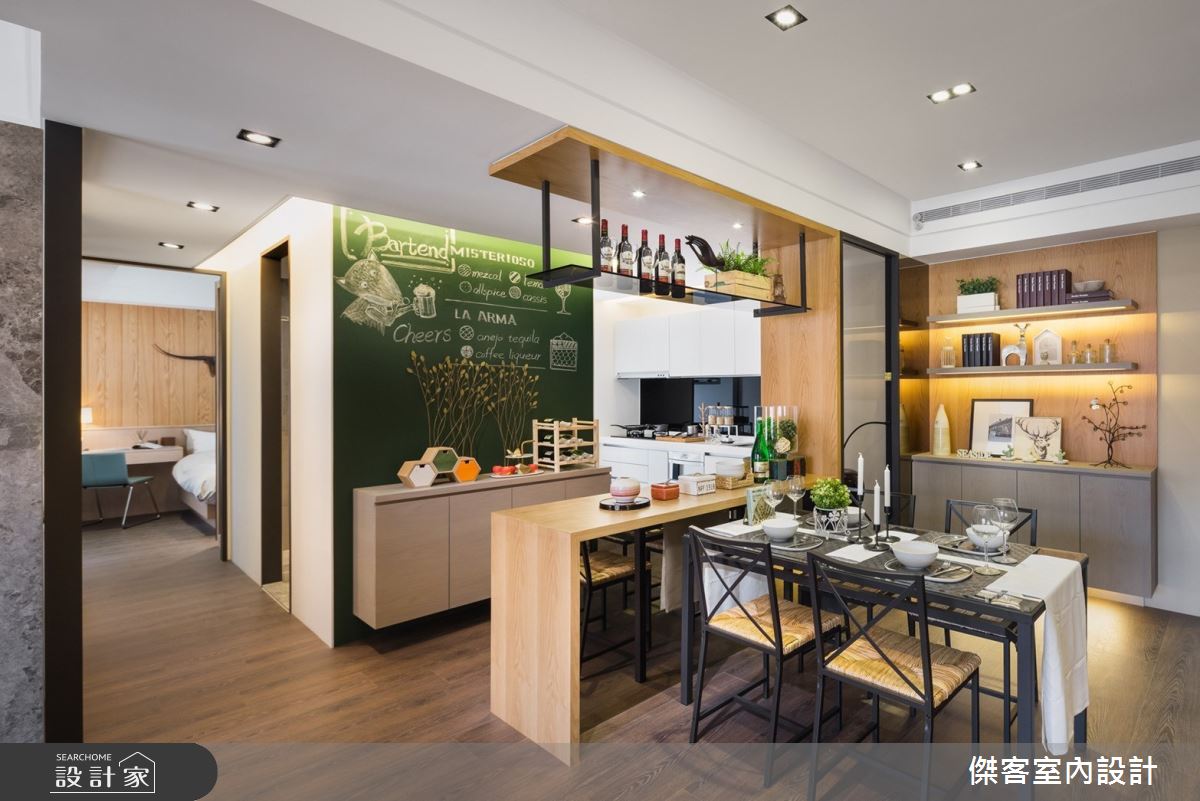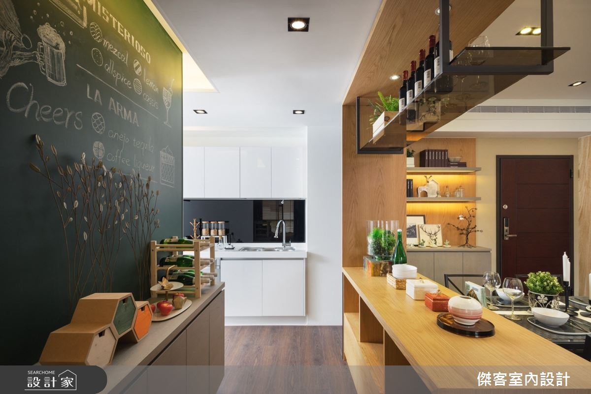 欲在居家空間裡打造具備私廚料理的用餐環境,以紋理鮮明的梧桐木皮作為空間襯底,牆面上的切割線凸顯牆面設計感,大面積包覆立面帶來溫馨的氛圍。在開放式餐廚區域的規劃上,先是安排餐桌,而緊臨的輕食吧台結合收納機能;通往內部料理空間的牆面設計黑板漆,可以書寫料理的菜色與步驟,營造溫馨私廚的風情。運用櫃體的擺設創造開放式餐廚的變化性,茶玻與黑鐵組成的屏風替玄關與廚房做了優雅的分界,也讓緊鄰露台的廚房採光能夠稍稍穿透到落塵區。