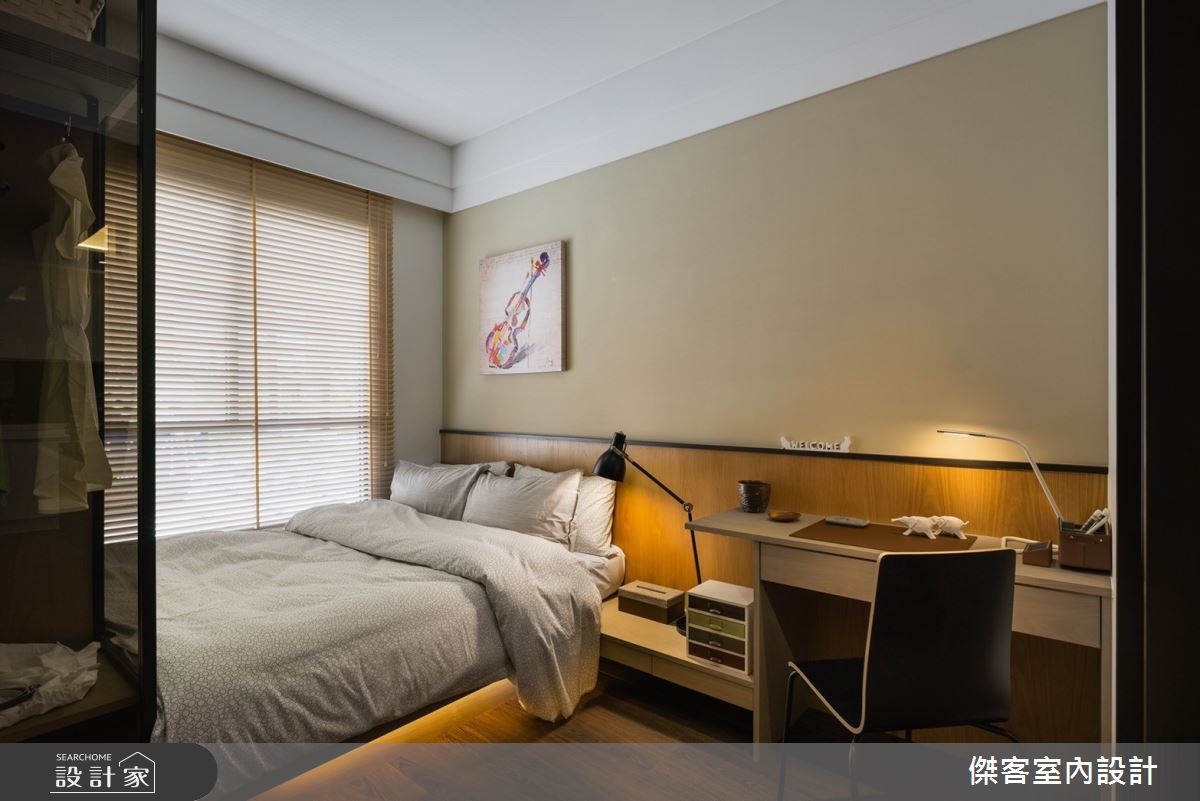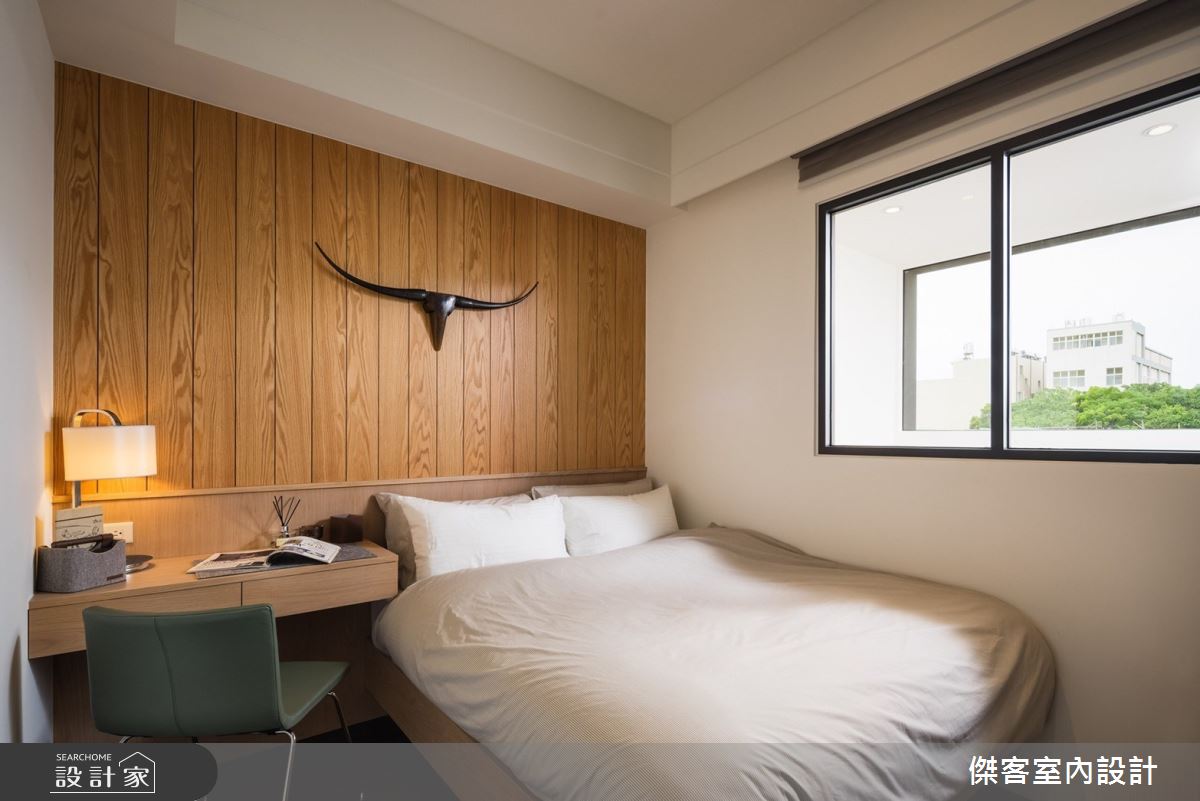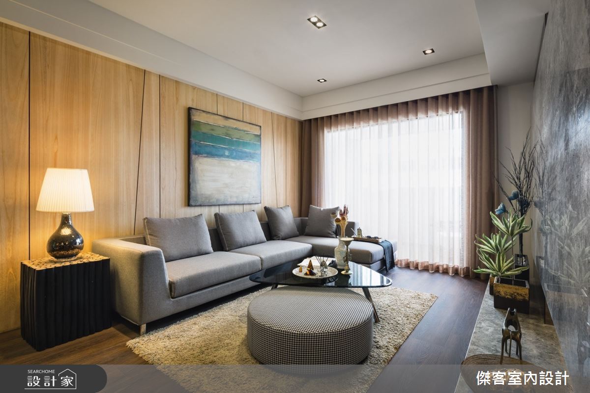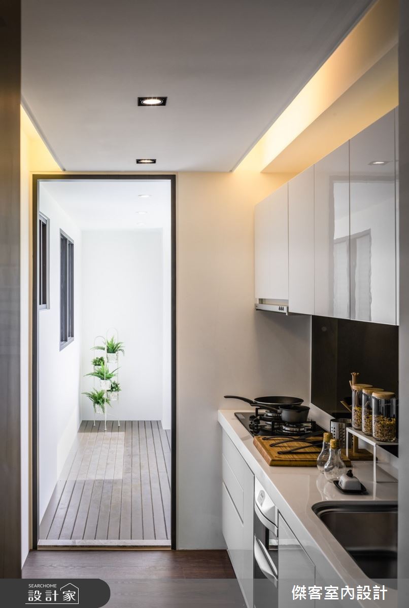 欲在居家空間裡打造具備私廚料理的用餐環境,以紋理鮮明的梧桐木皮作為空間襯底,牆面上的切割線凸顯牆面設計感,大面積包覆立面帶來溫馨的氛圍。在開放式餐廚區域的規劃上,先是安排餐桌,而緊臨的輕食吧台結合收納機能;通往內部料理空間的牆面設計黑板漆,可以書寫料理的菜色與步驟,營造溫馨私廚的風情。運用櫃體的擺設創造開放式餐廚的變化性,茶玻與黑鐵組成的屏風替玄關與廚房做了優雅的分界,也讓緊鄰露台的廚房採光能夠稍稍穿透到落塵區。