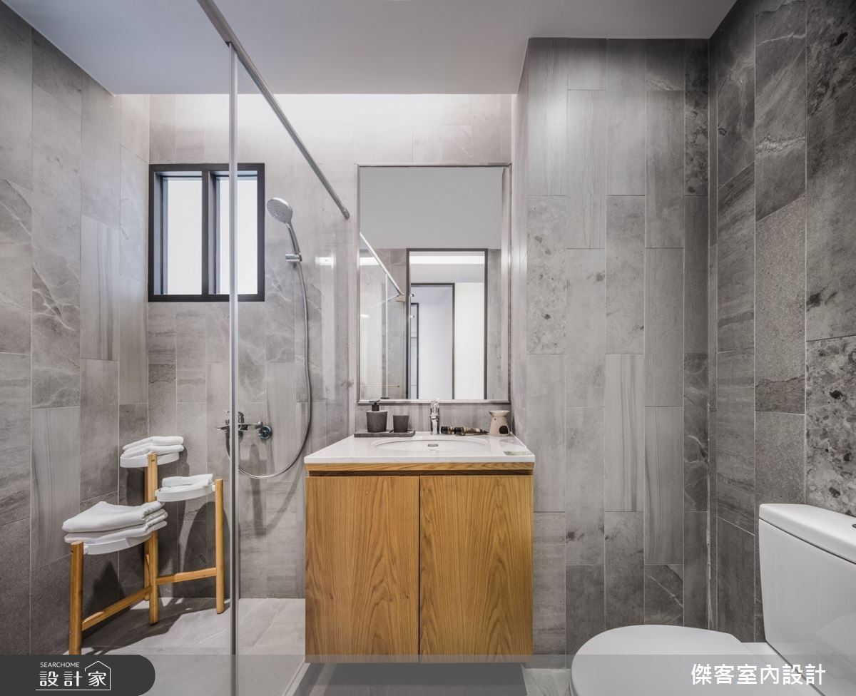 客廳電視牆加入了石材與少許鐵件元素,用材質原本的特質界定出空間;大理石自然的紋路猶如一幅潑墨山水,隱約透露著人文禪意。在不大肆變動隔間的狀況下,屋內穿透的視覺效果來自於書房空間的隔牆,利用玻璃材質與鐵件稍微區隔,而不是完全封閉,擺脫坪數的限制,有效優化視線與動線。衛浴空間呼應電視牆的石材,以灰白瓷磚為建材,藉由直向拼貼手法有效拉長空間,排列出與眾不同的視覺效果。