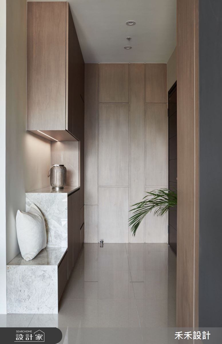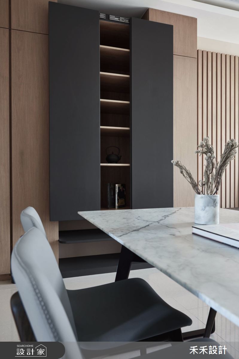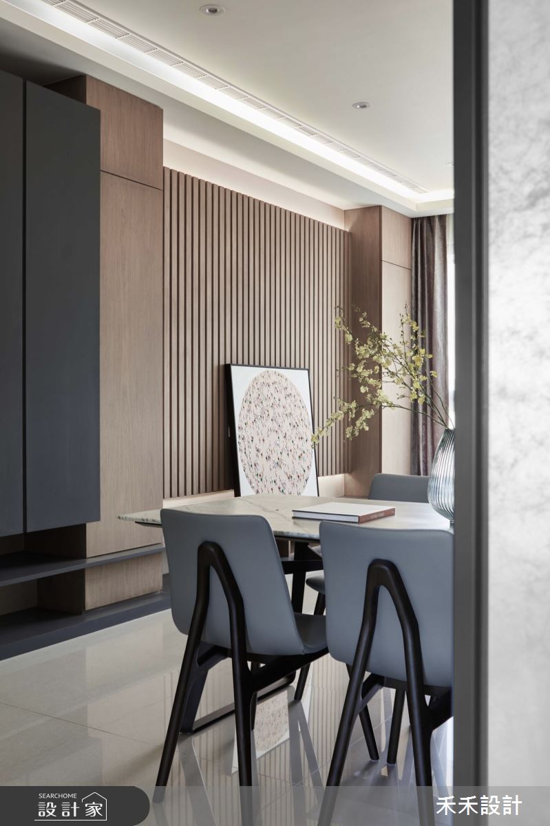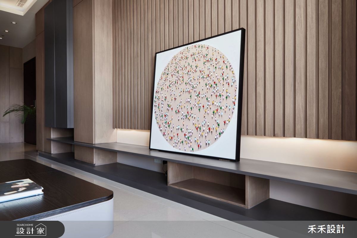 甫入玄關,在系統木櫃間留白,從容不迫地勾勒出一幅小型端景,並滿足收納機能。客廳主牆以日式格柵展開,讓視線坐落在幾何抽象畫作上,讓藝術創作成就美感生活,兩側櫃體則以不規則的排序,傳遞充滿設計感的居家語彙,讓收納本身即是風景。天花板在線版的輔助下,化解了樑柱所帶來的壓迫感,並結合間接式照明,讓視覺感更加簡潔俐落。