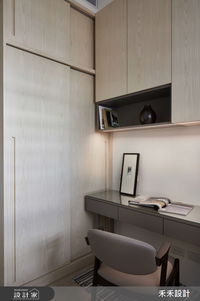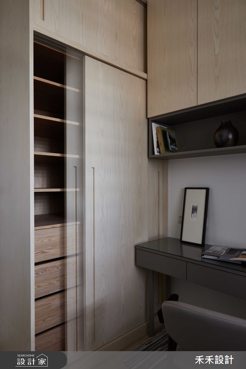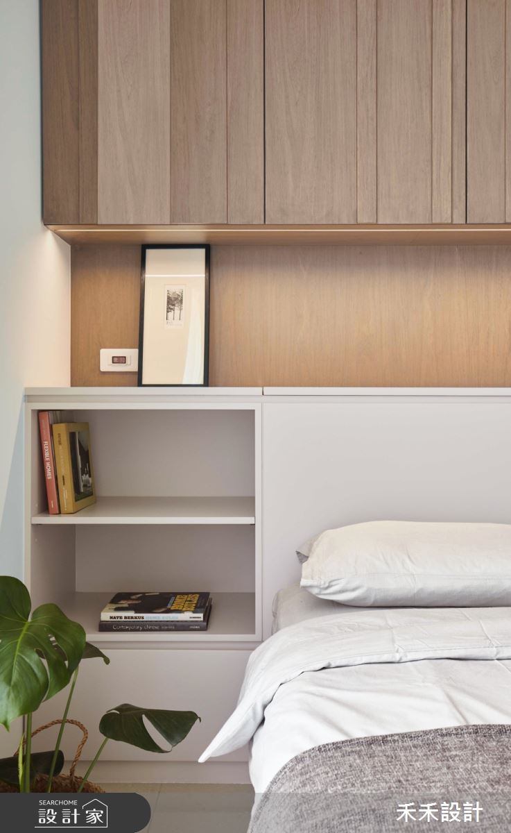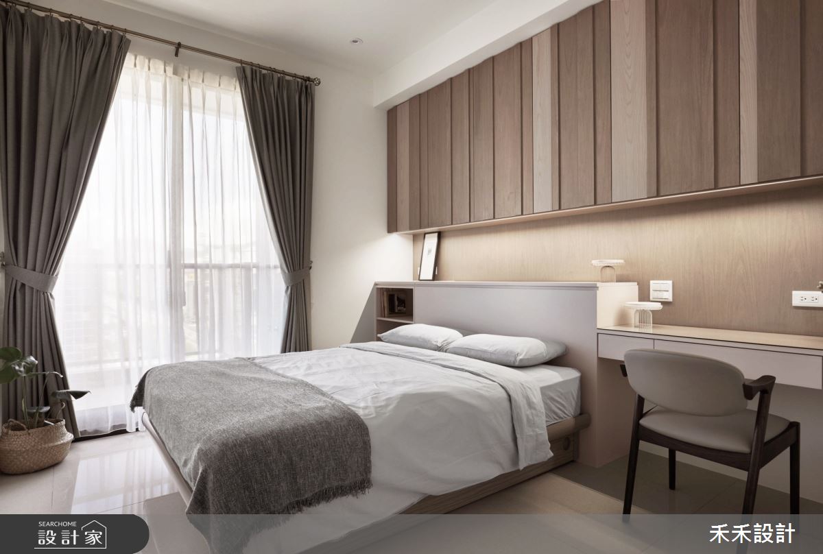 走入主臥,深淺不一的木作家私,充實收納機能,去除單調無趣的疑慮,增添趣味性十足的節奏感,並注入大地色系,讓休憩空間增添一絲沈穩安定的氛圍。
