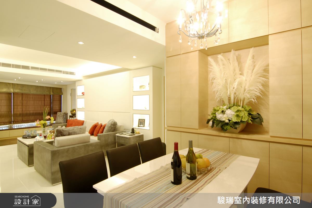 從大門進入室內,玄關側邊安排大面明鏡門片除了可以在出外時整理儀容,也令視覺感受延伸、放大;而去除隔間,開放式的客餐廳設計以淺色系為主調使空間顯得寬敞明亮,電視牆上下收納櫃及天花運用間接燈光創造放鬆舒適的生活情境,而沙發背後收納櫃兩邊六格展示櫃運用光線創造輕盈。進入餐廚空間,一整面頂天木色櫥櫃滿足收納需求,中間凹槽設計與客廳相互呼應,並減去櫃體沉重視覺。走進私人領域,收納與書桌整合於牆面,使用動線相當順暢,並以溫潤木質調帶來休閒寧靜的氛圍。