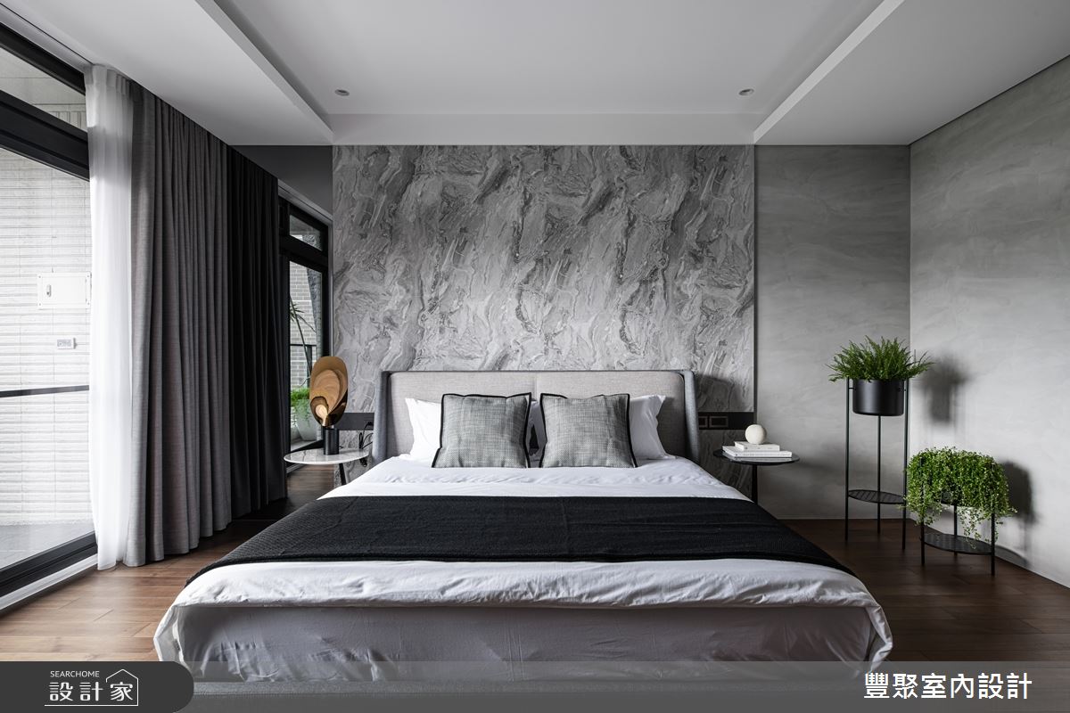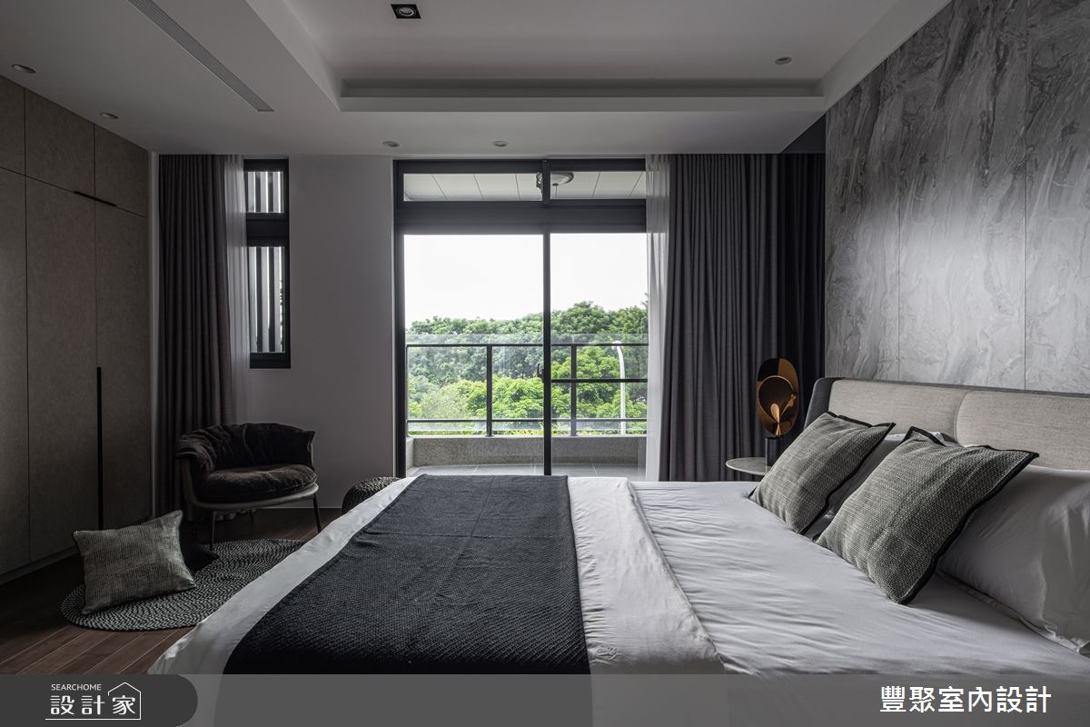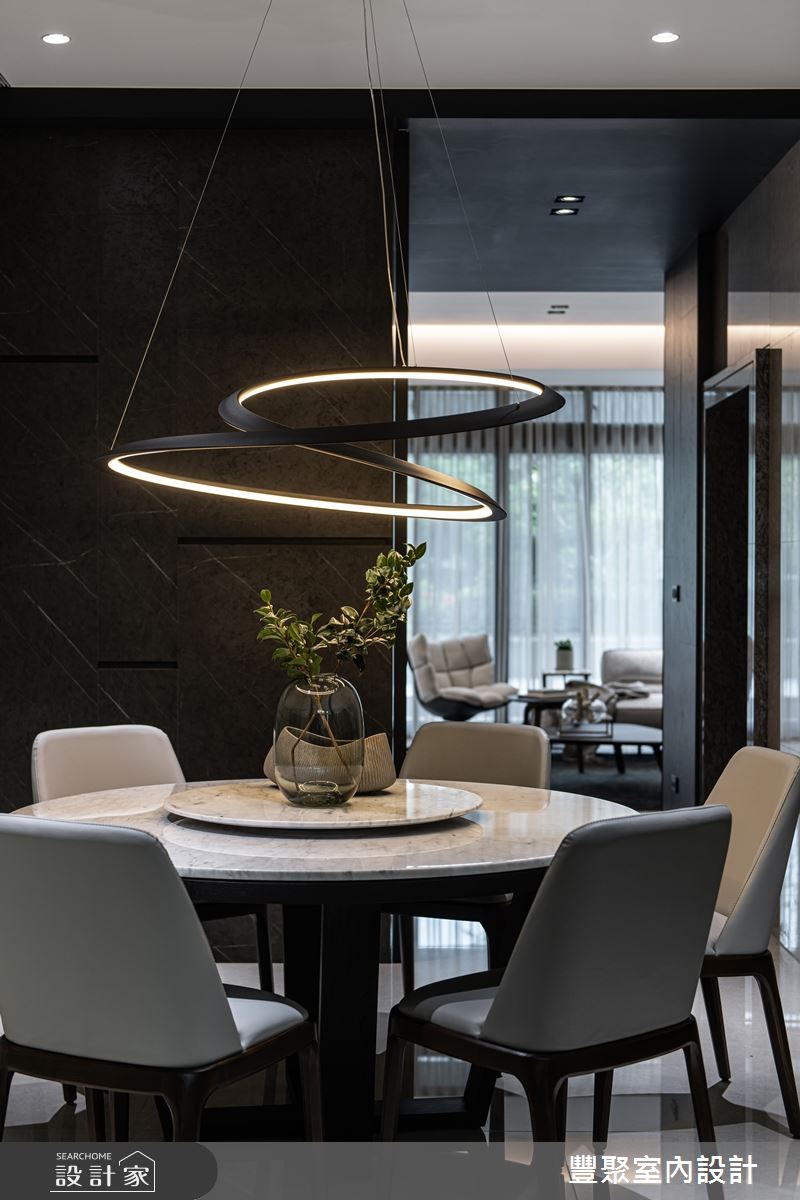 1F 作為視聽室使用,不只做為回家後轉換心情的場域,也配置輕鬆的中島吧檯,成為接待親友時的歡聚空間,並透過沉穩素樸的黑灰色為背景,搭配些許木質家具、櫃體以及明亮的軟件,讓視覺瞬間跳出亮點;2F 則是客廳空間,賦予明亮寬廣的格局視野,並串聯餐廳、廚房的動線,創造充滿互動感的情境,且在餐廳天花板懸掛進口餐吊燈,提升餐區的質感氛圍;主臥內,保留寬闊格局,在床頭旁側裝飾鏡面,再利用窗面納入好採光與美景,讓臥室空間感雙倍延伸放大!