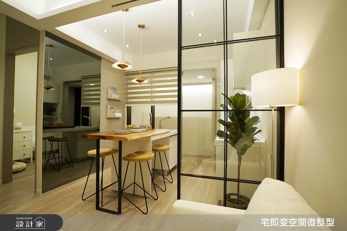 開放公領域客廳區,以不做滿電視牆保留視野的舒適感,後方刻意留空變身隱私感十足的小型書房領域,妥善發揮坪效增添機能;置中的電視牆格局配置,則替生活空間留下兩道便利且單純的動線。客、餐之間以一片黑框玻璃拉門,讓兩領域具有相互獨立感,同時予以阻擋油煙機能;餐、廚合一的設計,讓烹飪、用餐都能擁有寬敞活動區,而中島身兼用餐吧檯機能,給予愜意的用餐氣氛,同時提升用餐區的使用範圍與便利性。