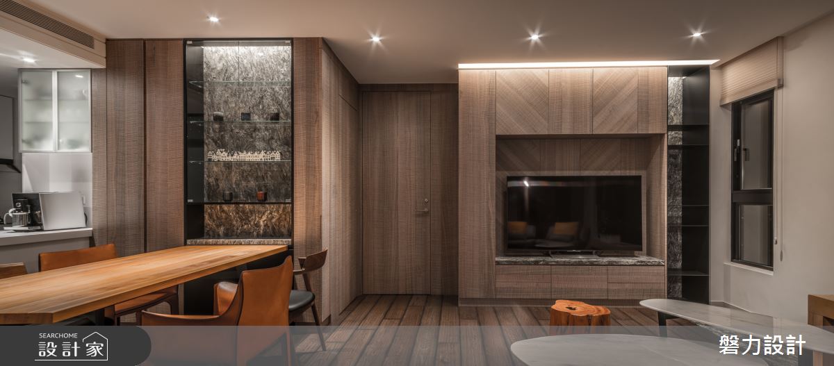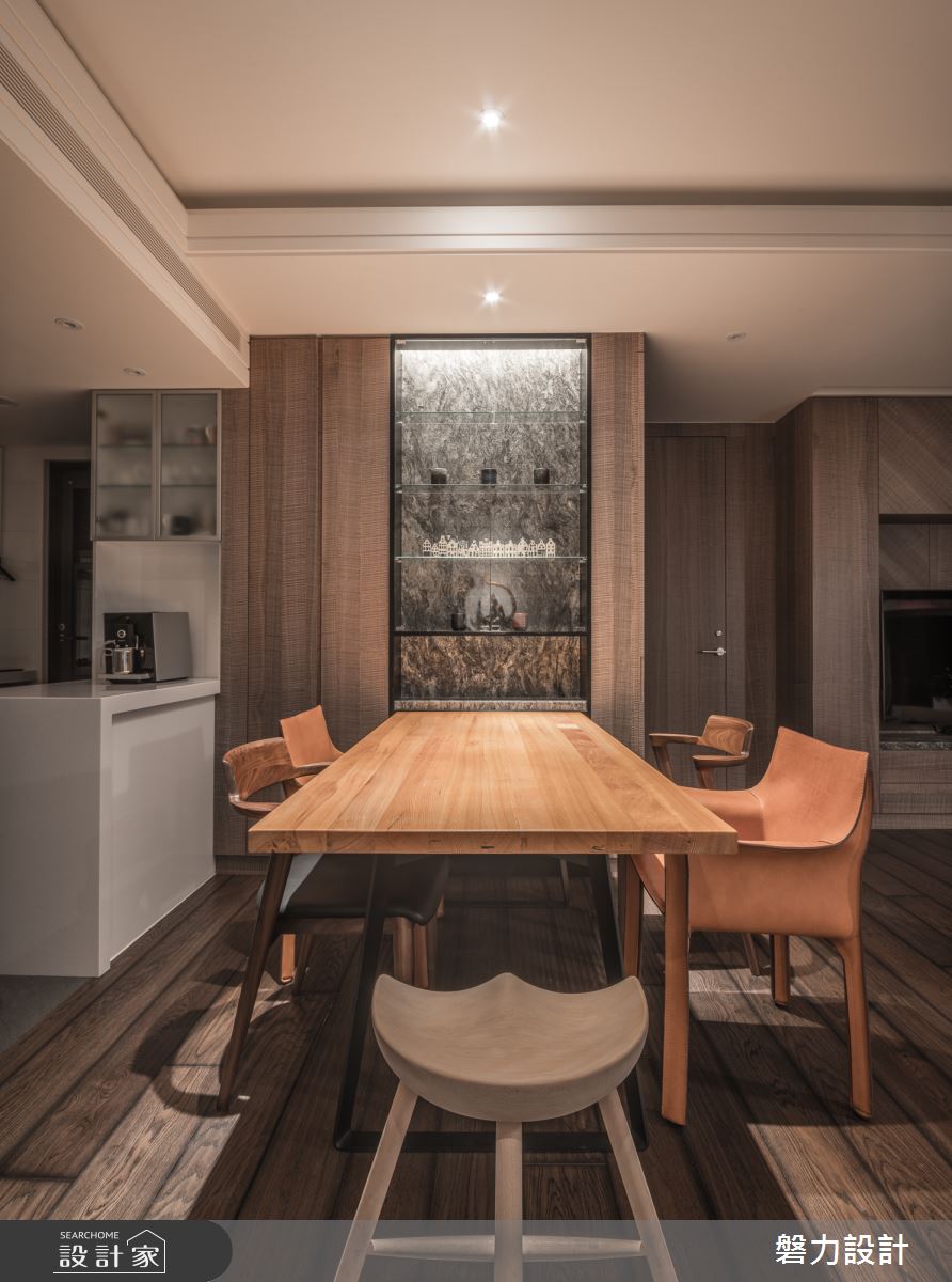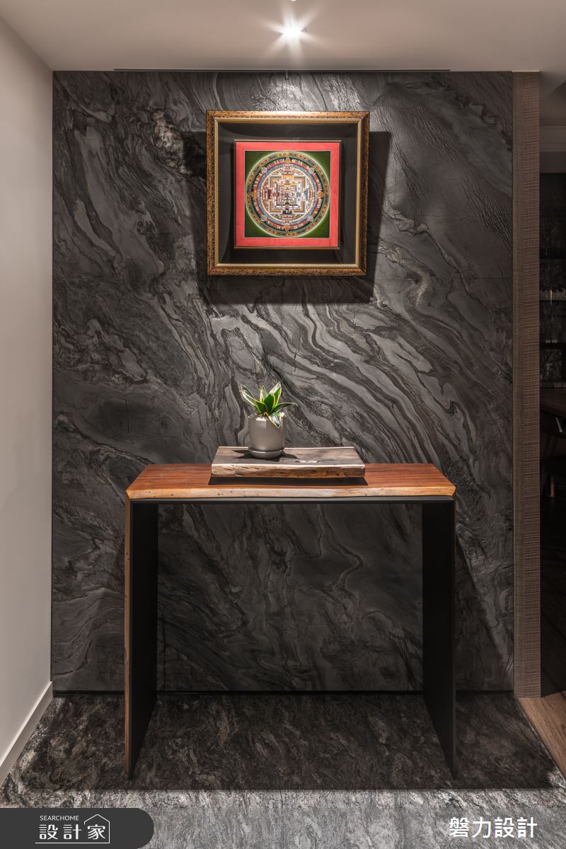玄關區透過深色調且鮮明的石材鋪設地坪與端景牆,搭配中式意象的畫作、原木桌與植栽,成為絕佳的迎賓色彩。輕輕轉彎後,走進公領域空間裡,一片木紋質感鋪敘空間,營造出溫潤的空間感受,手刮木地板所呈現的鮮明紋理,更傳遞一股自然無華的氣息;客廳裡無制式化的電視牆,而是結合木紋質感的收納櫃,整併機能,一旁則安排鐵件層板的展示機能,隨著藝術品與風格物件的替換,具有畫龍點睛、美化空間的效果;沙發單椅以弧形圍塑出領域核心,背牆懸掛中式畫作與雕塑品,挹注東方人文氣息。開放的餐廳空間裡,藉由原木質感的餐桌椅擺設,營造出自然的用餐氛圍,壁面的展示櫃利用鮮明紋理的石材襯底,伴隨燈光的映照下,烘托人文藝術之美。
